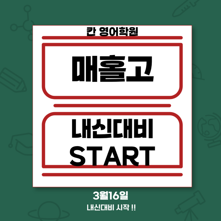 안녕하세요 :) 칸 영어학원입니다! . . . 안녕하세요 :) 칸 영어학원입니다! 방학이 엊그제였던 것 같은데 벌써 우리 아이들의 새 학기가 시작되었네요 새 학기가 시작되었다는 건… 우리 아이들의 시험도 곧 시작된다는 이야기겠죠! 그래서 저희 칸 영어학원에서는 3월 16일부터 매홀고 내신 대비가 시작됩니다!!! . . . . 최근 저희 학원에서는 정말 기쁜 소식들이 있었는데요 우리 매홀고아이들이 연세대, 고려대, 성균관대, 한양대, 중앙대 등 다양한 대학에 합격하는 좋은 결과를 만들었습니다~~ 위 대학에 합격한 학생들에게는 한 가지 공통점이 있었는데요! 저학년 때부터 저희 학원과 함께했거나, 중·고등 내신까지 꾸준히 함께 공부해 온....... <img src="https://blogthumb.pstatic.net/MjAyNjAzMTJfMTk1/MDAxNzczMzIwMTY2ODY3.3PsGrBpugsfgzrkop1-3_8AXjFwCEgX2mjr0CXdiXgwg.cKfltZ7Pm52wTruXSTWgzsYTYjW9yoWtkkUhRkco2mIg.PNG/%3F%A0%9C%EB%AA%A9%EC%9D%84_%3F%9E%85%3F%A0%A5%3F%95%B4%EC%A3%BC%EC%84%B8%3F%9A%94._%283%29.png?type=s3" />