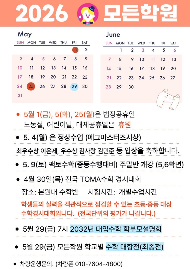 4월 1차 내신평가가 끝나고 가정의 달 5월이 되었습니다. 최근 상담에서 가장 많이 듣는 말입니다. 문제는 푸는데, 서술형에서 점수가 떨어져요. 생각보다 시험을 보면 점수가 안나와요등등 이런 현상은 단순한 노력의 문제가 아니라 학습 방향의 문제입니다. 5월 모든 학원 일정 5월은 아이의 실력을 다시 설계하는 달로 준비했습니다. 4월 30일 객관적 실력 진단 전국 TOMA 수학 경시대회 ✔ 전국 기준으로 현재 위치 확인 ✔ 단원별 취약점 분석 ✔ 사고력 수준 진단 잘하는 줄 알았던 부분과 실제로 부족한 부분을 명확히 구분합니다. 특히 전국단위의 대회로 자신의 초등, 중등 점수가 전국에서 몇번째인지 알수 있게 됩니다. 에그마스터즈....... <img src="https://blogthumb.pstatic.net/MjAyNjA0MjlfODcg/MDAxNzc3NDYxNDQ3MDU4.281c5FJQcED4UiE4854DDf3Aqm6yyiXHxIZTbKY-QCEg._NP_eTTwgKM-ggl2gJ-fNQdXou6wedhCBaWZM3yH9G4g.JPEG/1776999488357.jpg?type=s3" />