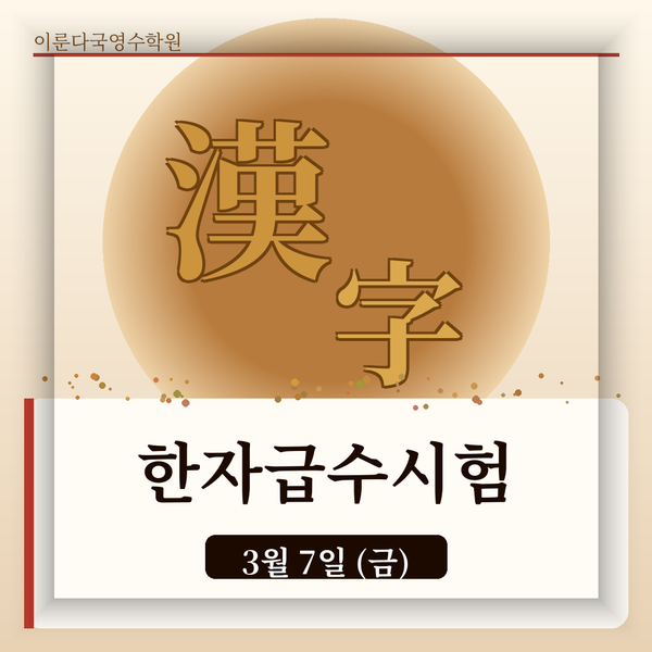 안녕하세요, 이룬다국영수학원입니다. 이번 3월 7일(금), 저희 학원이 "한자급수시험 공인 시험장" 으로 지정되어 처음으로 시험을 시행하게 되었습니다. 그동안 별도의 시험장으로 이동해야 했던 불편함을 덜고, 익숙한 환경에서 시험에 집중할 수 있도록 이번 기회를 마련하였습니다. ✨ 공인 시험장 지정, 이렇게 달라집니다 낯선 시험장에서의 긴장감은 실력 발휘를 방해하는 요소 중 하나입니다. 이번 시험은 평소 수업이 이루어지는 익숙한 교실 환경에서 진행되며, 담당 선생님들이 직접 안내와 감독을 맡아 아이들이 최대한 편안한 상태에서 시험에 임할 수 있도록 세심하게 준비하였습니다. 시험 당일에는 입실 안....... <img src="https://blogthumb.pstatic.net/MjAyNjAyMjZfMjM4/MDAxNzcyMTA3MzE1OTY2.jXIGqh-_OqfYeqT-LhWwj2B47nN_24-iMXyg-ytNxOsg.OfjzEFkfyHl1QPJEnGNQu0nRr2Dl6m88HVq32mQmTycg.PNG/%BD%E6%B3%D7%C0%CF_600.png?type=s3" />