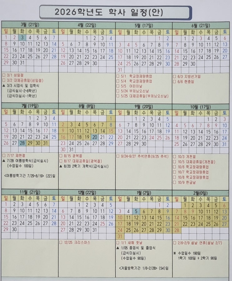안녕하세요 궐동수학 최강수학 세교캠퍼스 원장 이은경 입니다. 학부모님들이 새 학년을 준비할 때 가장 먼저 확인하는 것 중 하나가 바로 학사 일정이죠. “방학은 언제인지”, “연휴는 얼마나 이어지는지”, “2학기는 언제 시작하는지” 미리 알고 있으면 아이 공부 계획 세우기가 훨씬 수월합니다. 오늘은 2026학년도 대호초 학사 일정(안)을 기준으로, 학부모님들이 꼭 알아두면 좋은 핵심 포인트만 정리해 보겠습니다. 2026학년도 학사 일정 한눈에 보기 새 학년은 3월 시작 → 1월 학년 마무리 → 겨울방학 구조로 진행됩니다. 전체 수업일수는 190일 1학기 100일, 2학기 90일 요즘 학교는 수업일수가 꽤 촘촘하기 때문에 방학과 연휴를....... <img src="https://blogthumb.pstatic.net/MjAyNjAzMTJfMTA0/MDAxNzczMzA4MjkxNzg3.Hbmyf13cElvRAmfNPI_iU2YH4RCYV1Ma5uSrQ-JEGogg.UCETJZ0cuk0SreaCCtcDkrjWbE0TLDnUZEMPBvTP2Ekg.JPEG/20260310_194007349.jpg?type=s3" />
