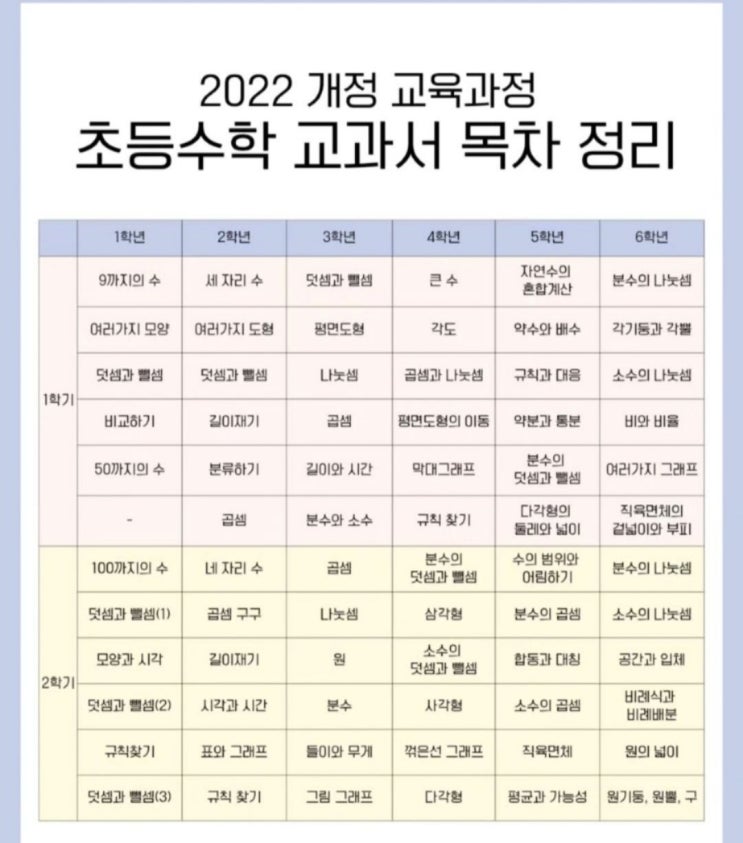 2022 개정 교육과정 수학 교과서 목차 3학년부터 6학년까지의 핵심 전략 초등 수학의 기초부터 심화까지, 아이들의 수학적 사고력을 깨워주는 모든학원입니다. 최근 2022 개정 교육과정이 도입되면서 학부모님들의 고민이 깊어지고 있습니다. 수학은 계통 학문이기에 학년별 연계성을 파악하는 것이 무엇보다 중요합니다. 학년별 교과 핵심과 교과서 필수 개념 1학년, 2학년 기초연산의 완성 3학년: 수학의 속도와 연산의 기초 형성 3학년 수학은 수학의 개념도입 과 속도(빠르기)입니다. 본격적으로 나눗셈과 분수, 소수가 등장하며 계산의 양이 늘어납니다. 나눗셈의 검산 과정과 분수의 종류(단위분수, 진분수, 가분수, 대분수) 이해 결과보다....... <img src="https://blogthumb.pstatic.net/MjAyNjAzMTFfMjkx/MDAxNzczMjI4NzE0NzM5.ufpjHs-HF51DXNOWKLzKudBm2Lrf0sHsOxyohpI2Sygg.FGUhKLkRa3ue81NUuGpnUjfE8UPAQK597n_Q3wBt0vgg.JPEG/Screenshot_20260311_195829_NAVER.jpg?type=s3" />