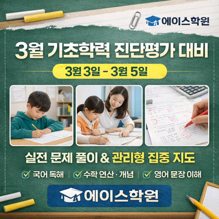초등·중등 기초학력평가란? 오산영수학원 에이스학원 3월 집중 대비 3월은 새 학년이 시작되는 동시에 초등 기초학력평가, 중등 기초학력진단평가가 실시되는 중요한 시기입니다. 많은 학부모님들께서 “기초학력평가가 내신에 반영되나요?” “못 보면 큰일인가요?” 라는 질문을 하십니다. 결론부터 말씀드리면 기초학력평가는 내신처럼 직접 반영되는 시험은 아닙니다. 하지만, ⚠ 이 시험에서 드러나는 ‘기초 격차’는 중학교 내신, 고등학교 성적까지 이어지는 출발선이 됩니다. 기초학력평가란 무엇인가? 기초학력평가는 학생이 해당 학년에서 반드시 갖추어야 할 ✔ 읽기 능력 ✔ 기초 연산력 ✔ 기본 개념 이해도 ✔ 문장 해석....... <img src="https://blogthumb.pstatic.net/MjAyNjAyMjVfMjUy/MDAxNzcxOTg5MjUxMTcx.k5qAjyGgl2do3YPU-khbp-V8jxEkbldYA3MlC3AZia0g.4xTZjY0cB5GA0cLJxRqmRjN8sU9oEfX55AodJVyF_dkg.PNG/900%A3%DFfile%A3%DF00000000ec3c72069502a58f2a56767c.png?type=s3" />