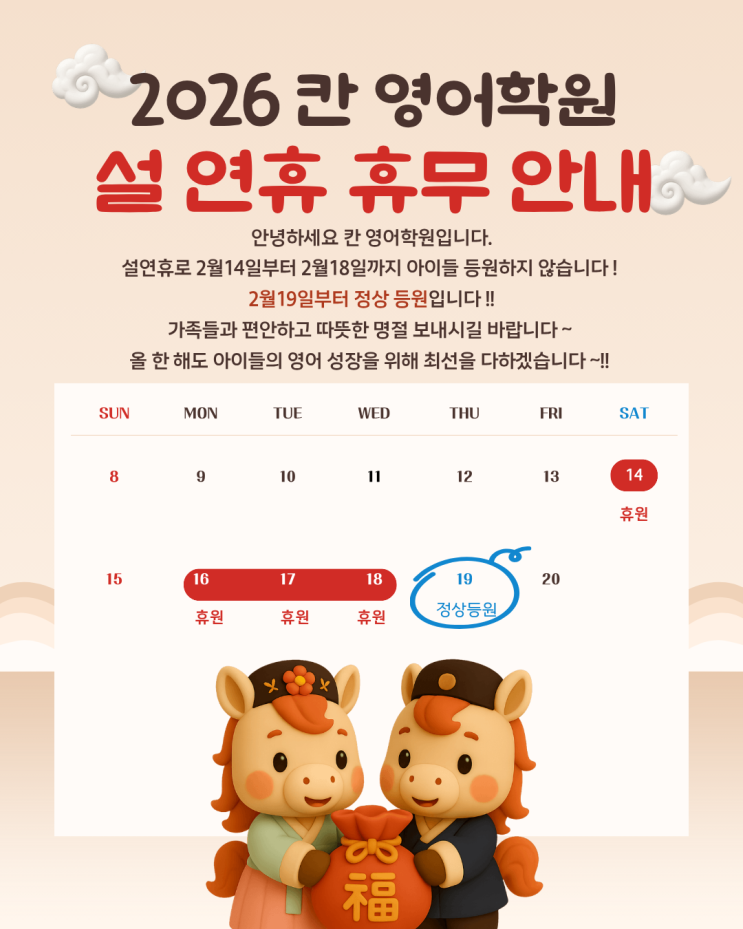 안녕하세요 ! 칸영어학원입니다 !! 2026년 2월 14일부터 2월18 일까지 설연휴로 아이들 학원 등원하지 않습니다 ~~ 2월19일부터 아이들 정상 등원합니다 !! . . . 2월14일~2월18일까지는 레벨테스트 및 상담 진행이 어려우니 네이버 톡톡으로 문의 주시면 감사하겠습니다~~ 즐거운 명절 보내시고 다들 새해 복 많이 받으쎄용~~ <img src="https://blogthumb.pstatic.net/MjAyNjAyMTFfMjMy/MDAxNzcwODA1OTk4NzU5.qvZ6_YhKGJJt9luHkc8LdQk_Q6z2QhwQ_9b5rXXeVaog.PRKICGXtAxkoJHyIq9JPPahuYRK7wZNKp2jl1XIdY7og.PNG/%C1%A6%B8%F1%C0%BB_%C0%D4%B7%C2%C7%D8%C1%D6%BC%BC%BF%E4._%281%29.png?type=s3" />