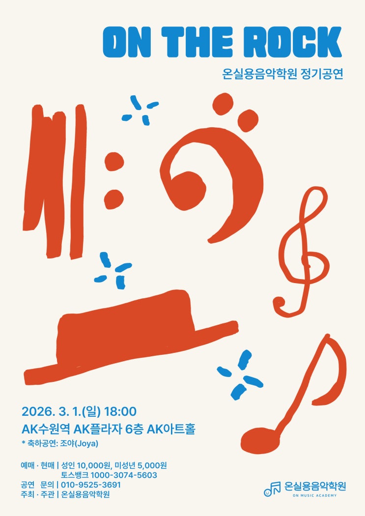 안녕하세요! 온실용음악학원입니다. 2026년 3월 1일 일요일 6시! 수원역 AK플라자 6층 AK아트홀에서 온실용음악학원 정기공연 온더락을 진행합니다. 학원생들이 진심을 담아 준비한 공연으로 각자의 열정과 성장을 무대 위에서 보여드릴 예정입니다. 따뜻한 응원과 관심으로 함께해 주세요. 티켓 안내 *예매 현매 금액은 성인 10,000원 미성년 5,000원입니다. *예매 입금은 토스뱅크 1000-3074-5603(김온유) 로 입금해주시면 되고 반드시 입금자분 성함과 연락처,성인n명,미성년n명 적은 후 01095253691로 문자 주시면 됩니다. *티켓 배부는 공연 당일 공연장에서 오후 5시에 배부 예정이며 5시 30분부터 입장입니다. *현매는 공연장에서 현금 및....... <img src="https://blogthumb.pstatic.net/MjAyNjAyMTJfMTkx/MDAxNzcwODYyODA4NTI2.ocJgwpYJk_omdFA3d_X9OLfuvm8hM6Wzuu1ZE6Jxz6Ag.FL72YkeXPI9JWyXYmi-ItoKrg4am1eA1CAMwoRaYGisg.JPEG/%C7%D0%BF%F8%C6%F7%BD%BA%C5%CD.jpeg?type=s3" />