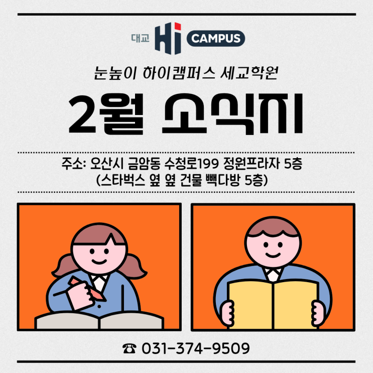안녕하세요 대교 하이캠퍼스 세교학원입니다. 어느덧 새해가 지나고, 2월이 찾아왔습니다. 방학 기간 동안 아이들이 꾸준히 공부하며 성장할 수 있도록 이번 달에도 다양한 학습 일정과 이벤트를 준비했어요. 오늘은 2월 주요 일정과 학습 안내, 이벤트 소식을 함께 전해드릴게요 ✨ ✅ 2월 주요 학습 일정 안내 2월에도 우리 아이들의 학습 흐름을 끊기지 않도록 체계적인 일정으로 운영하고 있습니다. ✔️ 방학 특강 진행 ✔️ 복습 중심 학습 운영 ✔️ 취약 단원 집중 관리 ✔️ 개별 맞춤 지도 강화 특히 방학 기간은 다음 학기를 준비하는 아주 중요한 시기입니다. 기본기를 다지고, 부족한 부분을 채울 수 있도록 꼼꼼하게 관리....... <img src="https://blogthumb.pstatic.net/MjAyNjAyMTJfMjY0/MDAxNzcwODYxNDc3ODgw.59AwZXfw76QQqFk9AXuphz2Unw62w3n0YSid5V0p1Lsg.zMSKVSS6rcSmSbYz78_Pmbmti_ScE4GO1HjLyxOED9Ug.PNG/%C1%A6%B8%F1%C0%BB_%C0%D4%B7%C2%C7%D8%C1%D6%BC%BC%BF%E4._%281%29.png?type=s3" />