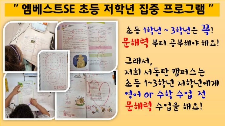 안녕하세요! 엠베스트SE 서동탄 캠퍼스입니다. 우리 아이, 책상 앞에 오래 앉아 있는데 왜 성적은 제자리일까요? 정답은 바로 **'문해력'**에 있습니다! ⚠️ 혹시 우리 아이도 '구경꾼'인가요? 대한민국 1타 강사의 강의를 봐도 성적이 안 오르는 이유! 보는 것은 공부가 아닙니다. 인강 시청은 그저 '입력'일 뿐이죠. 유창성의 오류: 강사의 설명을 듣고 "다 안다"고 착각하는 뇌의 속임수입니다. **진짜 실력은 '출력'**에서 나옵니다.스스로 설명할 수 있어야 진짜 내 것이 됩니다. 서동탄 캠퍼스만의 '초등 저학년 집중 프로그램' 초등 1~3학년은 공부 근육을....... <img src="https://blogthumb.pstatic.net/MjAyNjAyMTRfMTM3/MDAxNzcxMDM5MDAxMzgy.9bOf82GGSVKjfsyx5qeriVenXd87b_Zas9qV39EjwK8g.ModmgDlxGWq-D6XWW96ALFsBurSj93zyXCJqbGDcv3Ug.JPEG/KakaoTalk_20260209_134924751.jpg?type=s3" />