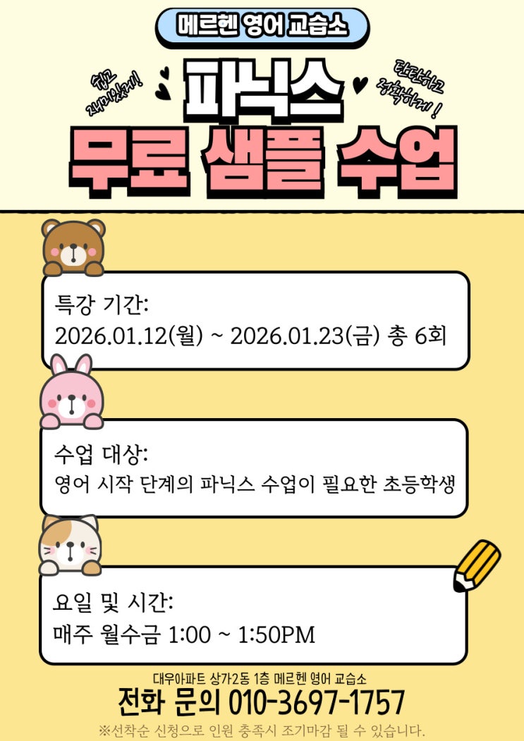 안녕하세요 메르헨 영어 교습소입니다. 영어를 처음 시작하는 아이들, 파닉스가 중요한 건 알지만 “우리 아이가 잘 따라올 수 있을까?” “학원 수업 분위기는 어떨까?” 이런 고민되셨던 분들을 위해 파닉스 무료 샘플 수업을 준비했습니다. 이번 샘플 수업은 ✔️ 영어 시작 단계의 아이들이 ✔️ 부담 없이 파닉스를 경험해 보고 ✔️ 수업 방식과 분위기를 직접 느껴볼 수 있는 시간입니다. ✏️ 메르헨 영어 파닉스 수업은 ‘공부’가 아니라 재미있는 경험으로 시작될 수 있도록 돕고 있습니다. 단순 암기가 아닌 소리 중심 파닉스 아이 눈높이에 맞춘 활동형 수업으로 우리 아이 영어의 남다른 시작을 선물해주세요! ....... <img src="https://blogthumb.pstatic.net/MjAyNTEyMTZfMjIw/MDAxNzY1ODcxMTY5OTMx.MJhK-AqMxRWB_KLBaR4vCHhkExLvRj5VCuhsdDeMf8Ug.YfKpAtDK8vBB3qUUWbAzkzpY89PAFX8Oj7xTsEzG8tcg.JPEG/%C6%C4%B4%D0%BD%BA_%B9%AB%B7%E1_%BB%F9%C7%C3%BC%F6%BE%F7.jpg?type=s3" />