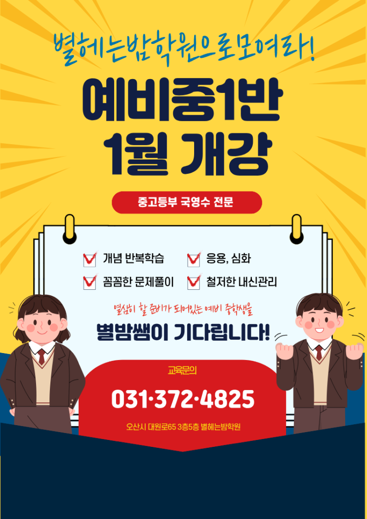 안녕하세요! 오산시 대원로에 위치한 중고등부 국영수 전문, 별헤는밤학원입니다. 어느덧 겨울방학이 다가오고 있습니다. 우리 6학년 친구들에게 이번 겨울은 초등학교를 마무리하고, 중학교 입학을 준비하는 가장 설레고도 중요한 시기입니다. 중학교 공부, 막연한 걱정만 하고 계신가요? "열심히 할 준비가 되어있는 예비 중학생을 별밤쌤이 기다립니다!" 별헤는밤학원에서 [예비 중1반 1월 개강] 소식을 전해드립니다. 이번에 안내해드릴 소식은 바로!! 왜 '별헤는밤' 예비 중1반일까요? 중학교 내신은 입시의 첫걸음입니다. 달라지는 학습 환경에 흔들리지 않도록 4가지 핵심 전략으로 지도합니다. ✅ 1. 개념....... <img src="https://blogthumb.pstatic.net/MjAyNTEyMjNfMjAz/MDAxNzY2NDc0NDg4Mjcw.EwlPp0OX1X10OXcS3CaukdE13ByVujUq36Ks2Hvyr8sg.eQQFyzYnkoi8LiQw5NP3cXpcPRxQfFC0PMtljA283Hwg.PNG/KakaoTalk_20251213_125040288.png?type=s3" />