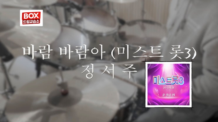 안녕하세요 BOX드럼교습소입니다. 이 번곡은 "정서주"가 부른 **「바람 바람아」**는 미스트롯3에서 많은 사랑을 받은 트로트 곡입니다. 이번 영상은 바람 바람아 드럼커버(쉬어버전)로, 곡의 감성과 트로트 특유의 리듬을 살려 연주한 드럼커버 영상입니다. 트로트 음악은 단순한 리듬처럼 들리지만 드럼에서 리듬의 흐름과 안정적인 템포 유지가 매우 중요한 장르입니다. 바람 바람아 드럼커버 연주 포인트 발라드 감성에 맞춘 절제된 드럼 그루브 보컬 중심을 살리는 부드러운 킥·스네어 밸런스 후반부 감정 상승에 맞춘 다이내믹 표현 곡 흐름을 유지하는 안정적인 템포 특히 후렴 부분에서는 곡의 감정을 살리기 위해 드....... <img src="https://blogthumb.pstatic.net/MjAyNjAzMDZfMTE5/MDAxNzcyNzcwMTA4MzA3.HBEAcl3JgoFnOOtORri1PNHuNqR_bSgBInxd_ErXb5Mg.Sk7gfx5_s-oX_0J_4As3U3pmSIf_wpumuPYvHeY_rC4g.JPEG/0000.jpg?type=s3" />