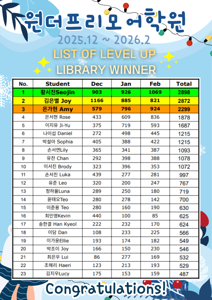 [배곧초등영어 Level-Up 영어독서 다독 이벤트 2025년 12월 ~ 2026년 2월 결과 발표]