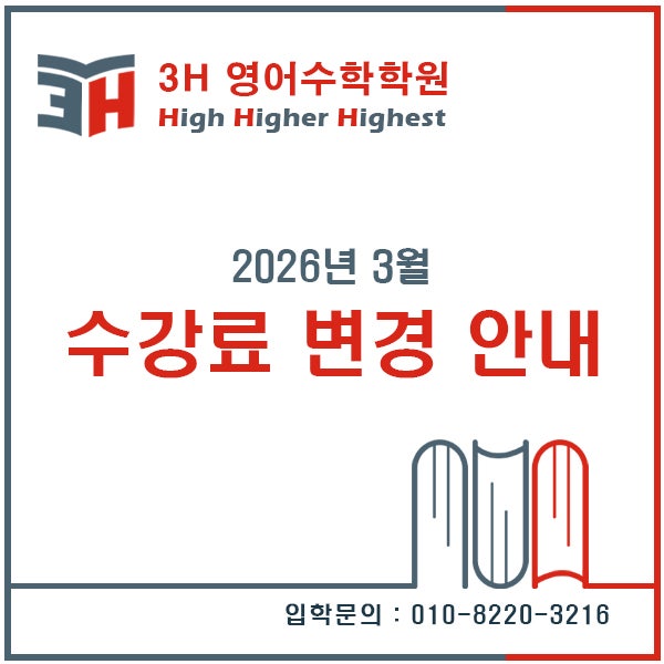 안녕하세요. 3H영어수학학원입니다. 저희 학원은 학부모님들의 부담을 조금이라도 더 덜어드리고자 배곧에서 가장 저렴한 수준의 학원비를 유지하고자 노력하고 있습니다. 또한, 학년이 올라감에 따라 자연스럽게 인상되는 수강료도 그 인상을 최대한 지연시키기 위하여 수강료가 인상되는 시점을 매년 3월로 설정하고 있습니다. 수업의 내용이 변경되는 시점은 1월이거나, 기말고사 이후이기 때문에 한 학년 위의 수업을 보다 저렴한 비용으로 2~3개월 이상 수강할 수 있는 셈입니다. 위와 같은 이유로 다가오는 2026년 3월에는 일부 학생들의 수강료가 변경됩니다. 매년 학원의 학생 구성원이나 수업 환경들이 변경되기에 작년에 비해 일부 변....... <img src="https://blogthumb.pstatic.net/MjAyNjAyMjRfMjQw/MDAxNzcxOTMwMDg1MzIx.AVHLaL7nqUcTmk-oa8EsvUqFsXjcDij1Jm6dlCfaY5Eg.PRCF4M7lFDsb-ivenbjoYLiyyZBYdQoANelFm8bJlcYg.JPEG/2026%B3%E23%BF%F9%BC%F6%B0%AD%B7%E1%BA%AF%B0%E6%BE%C8%B3%BB.jpg?type=s3" />