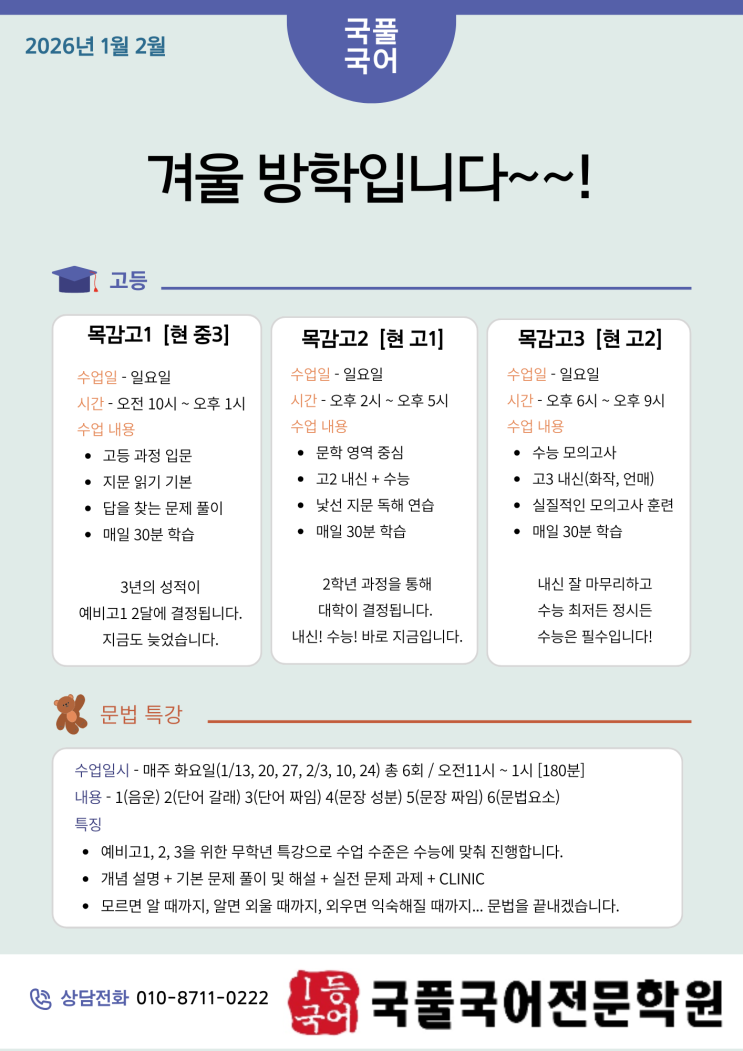 국어 학원, 예비고1은 언제부터 시작하는 게 좋을까요? – 12월에 가장 많이 듣는 상담입니다! “선생님, 고등학교 올라가기 전에 국어학원은 언제부터 다니는 게 좋을까요?” 중3 겨울울만 되면 상담 전화에서 가장 많이 듣는 질문입니다. 수학은 이미 선행을 시작했고, 영어는 학원 루틴이 어느 정도 잡혀 있는데, 국어는 항상 ‘나중에’로 밀려 있던 경우가 많습니다. “국어는 원래 잘 보는 애잖아.” “그래도 국어는 3등급은 나와서, 수학·영어가 먼저죠.” 그런데 실제로 고등학교를 보내 보신 부모님들은 대부분 이렇게 말씀하십니다. “국어를 너무 늦게 신경 썼던 것 같아요. 이미 모의고사가 4·5등급이 찍히고 나서야 심각성을 알게....... <img src="https://blogthumb.pstatic.net/MjAyNTEyMDJfMTQ2/MDAxNzY0NjgwOTIzNjYw.G0kqOjNz5HFMGc8unG2pIhGbIE-zW3COmt7F9FjB28cg.IiWBvVheIkAKL2mLygh70HSOK2rZFDzAJ0GG5FlvDM0g.JPEG/%B0%ED1-%C0%CC%B9%CC%C1%F6-0_%281%29.jpg?type=s3" />