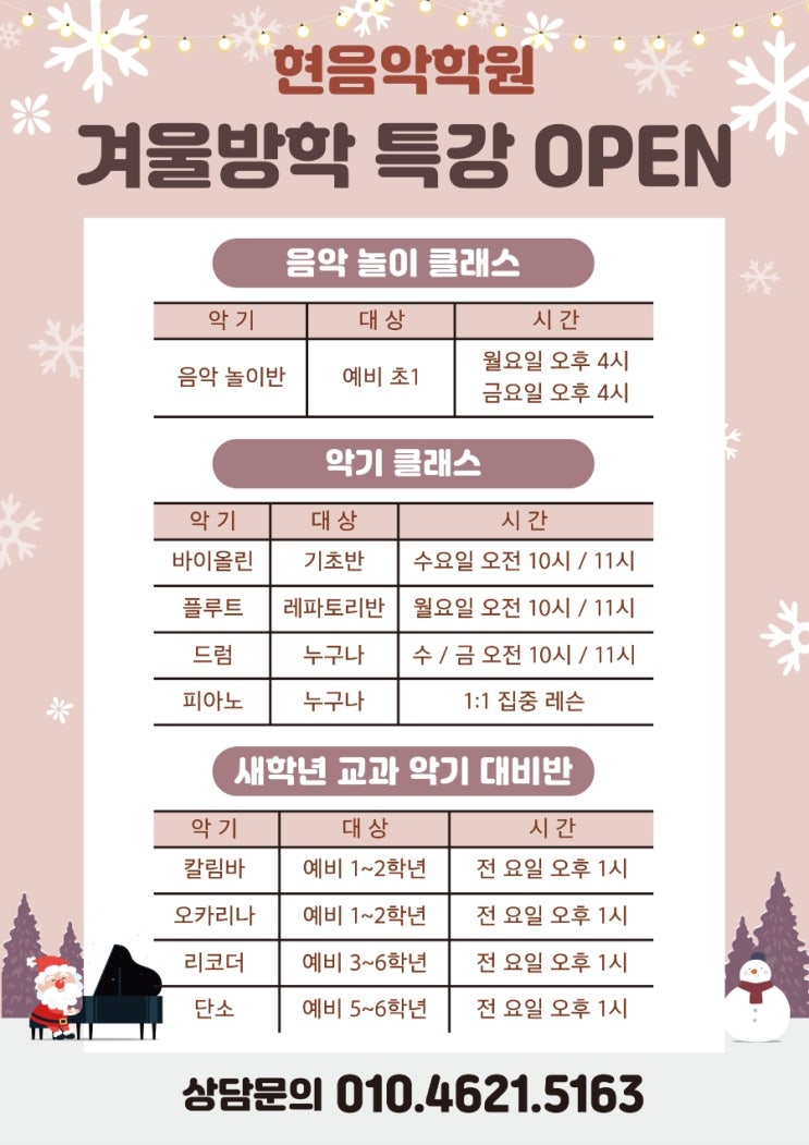 현음악학원 겨울방학 특강이 드디어 OPEN 되었어요! ❄️ 무료해지기 쉬운 긴 방학, 우리 아이가 음악과 조금 더 가까워지는 시간을 만들어 주세요. 음악놀이 클래스 예비·초1 아이들에게 딱 맞는 리듬·음감 놀이로 음악의 기본을 재미있게 배워요! 월요일 오후 4시/금요일 오후 4시 악기 클래스 바이올린·플루트·드럼·피아노까지! 아이의 흥미에 맞춰 선택할 수 있는 다채로운 악기 수업 ☆바이올린 기초반/레파토리반: 수 오전 ☆플루트 기초반/레파토리반: 월 오전 ☆드럼: 수/금 오전 ☆피아노: 1:1 집중 레슨(개인레슨) 새학년 교과 악기 대비반 학교 음악 시간을 위해 꼭 필요한 악기들을 방학 동안 미리 준비할 수 있....... <img src="https://blogthumb.pstatic.net/MjAyNTEyMDhfNjcg/MDAxNzY1MjAwMTg4MzYz.1ktuE0g-jo3RfkuQZv0clcA-XJwysZt1MBs0yeT6HTcg.QQH0C2Et5qZqCqfg0RWFN689-fvZ53HxvWeWwXi1JzIg.JPEG/900%A3%DF1764917465448.jpg?type=s3" />