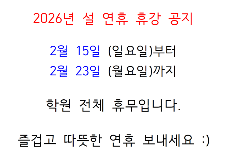 설연휴 휴강 공지(2026년 2월 15일~23일까지)
