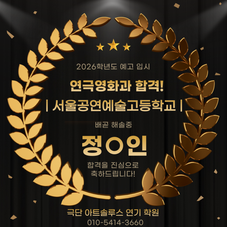 학원명 : 극단 아트솔루스 연기학원 학원등록 번호 : 제 1525호 학원비 : 15만 ~ 70만 ( 취미, 오디션, 입시 ) 안녕하세요 시흥시 배곧 유일 연기학원 극단 아트솔루스 연기학원입니다. 2026학년도 입시 결과가 점점 나오고 있습니다. 배곧 해솔중 3학년 정00 학생이 서울공연예술고등학교 와 한림연예예술고등학교에 합격하며 예고 2관왕을 달성하였습니다!! 군서고등학교와 서해고등학교의 유00학생, 홍00학생 역시 수시에 합격하였습니다 :) 2027학년도 연극영화과 입시를 희망하는 학생분들의 많은 문의 기다리겠습니다 :) 5층 501호 극단 아트솔루스 연기 학원 문의 전화 : 010-5414-3660 [원장] <img src="https://blogthumb.pstatic.net/MjAyNTExMTVfMTMy/MDAxNzYzMTg5MDU5NDUy.3uM0PFC2ncUxkk_W_51gufQ1_ovxH85yz8WYBc1IIlcg.InsVpgE81hylCEZN-CccEiROJa6p3sUJA9UP1OhvdeMg.PNG/001.png?type=s3" />