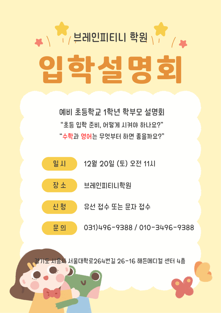 ✅ [브레인피니티학원] 예비 초등학교 1학년 학부모 설명회 “초등 입학 준비, 어떻게 시작해야 할까요?” “영어·수학은 무엇부터 하면 좋을까요?” 초등학교 입학을 앞둔 학부모님들이 가장 궁금해하는 내용을 초등 영어·수학 담당 선생님이 직접 이해하기 쉽게 안내드립니다. 학부모 설명회 1️⃣ 왜 초등 1학년이 중요한가? 초1은 학습 습관이 처음 만들어지는 시기 읽기·쓰기·집중력의 차이가 모든 과목 성적을 결정 “지금 어떤 준비를 해야 할까요?”에 대한 답 제공 2️⃣ 초등 영어 가이드 (영어) 초등학교 영어의 핵심 - 어린 시기에 영어에 노출될수록 음운 인식 능력이 더 빠르게 발달하며, 자연스러운 발음 형성이 보다 용이 초....... <img src="https://blogthumb.pstatic.net/MjAyNTEyMTBfNSAg/MDAxNzY1MzQyNTU3OTE0.y-BnfMTCAYVtRNJI3qj3PjojhYxcRuzG98Xss5uyrEQg.GlFXXl4eeHJ802zwhfrpqCOAZnrubwHIsieCjBETBdIg.PNG/%BF%B9%BA%F1%C3%CA%B5%EE%C0%D4%C7%D0%BC%B3%B8%ED%C8%B8.png?type=s3" />