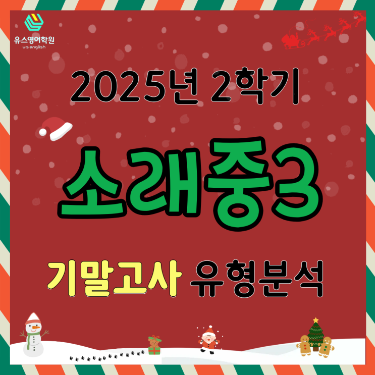 안녕하세요! 유스영어학원 입니다. 2025년 2학기 소래중3 기말고사 유형 분석을 공유하겠습니다. PART 1. 총평 어휘와 빈칸 문제의 수가 총 25문제 중 11문제를 차지하였습니다. 어휘 문제는 시험 범위에 포함되지 않았던 단어들이 출제되어 기본적인 어휘력을 요구하는 문제들이 다수 있었고, 빈칸 문제는 지문이 변형되어 출제되었기 때문에 선지를 정확하게 해석하고 정답을 추론하는 능력이 요구되었습니다. 이번 기말고사는 빈칸, 문장 삽입, 심경 변화, 함축 의미 등 2학기 중간고사와 비슷한 유형의 문제들이 많이 출제되었지만, 비교했을 때 난이도는 전반적으로 평이했습니다. 시험 범위에 해당되는 지문을 꼼꼼히 공부했다면 맞힐 수 있....... <img src="https://blogthumb.pstatic.net/MjAyNTEyMTBfODgg/MDAxNzY1MzUxMTAwNjkz.GyTK8-oVjI7K37czBU1t77n4v-dNLqch-d1jnRmdRLIg.ZPCPJpAtAKC1CJml38JcgfEnnYAIY3-tl0GzshNUgAIg.PNG/1.png?type=s3" />