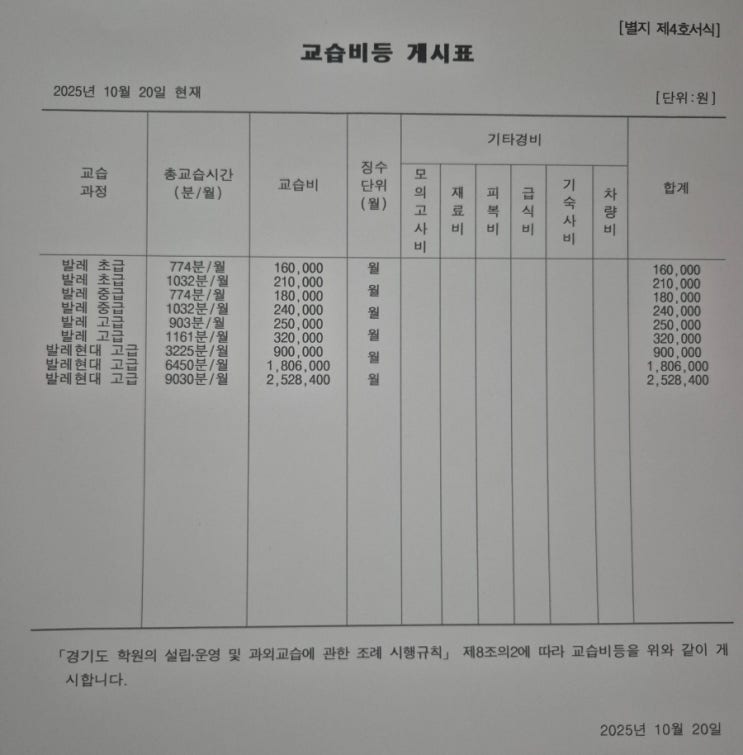 박해련무용학원 교습비 안내 -등록번호 제 1532호- 아래 이미지는 본원의 교습비 기준을 안내하기 위한 자료입니다. 모든 수업은 전공 지도 경험이 풍부한 전문 강사진이 진행하며, 학생의 목표와 수준에 따라 맞춤형 지도가 이뤄집니다. 박해련무용학원은 ‘기초부터 무대까지’ 단계별로 지도하며, 학생 한 명 한 명의 개성과 감성을 존중합니다. 현대무용, 실기·입시 전문, 그리고 예고 및 대학 진학까지 — 확실한 커리큘럼과 섬세한 피드백으로 성장의 길을 함께합니다. ※ 자세한 상담은 전화 또는 방문 시 가능합니다^^ ※ ☎️ 02-899-0731 경기 광명시 소하로 77 골든프라자 603호 <img src="https://blogthumb.pstatic.net/MjAyNTExMDlfMjgw/MDAxNzYyNjY4MTI0MTk5.2XK5TbBugr1LsID0g_qoaSZjd6kxyYGbSCmDg0A8K04g.7EVGE-s253VDFSMYCl_RhifyyKtLj8RNIBBj_IC4HnAg.JPEG/900%A3%DF1762667536136.jpg?type=s3" />