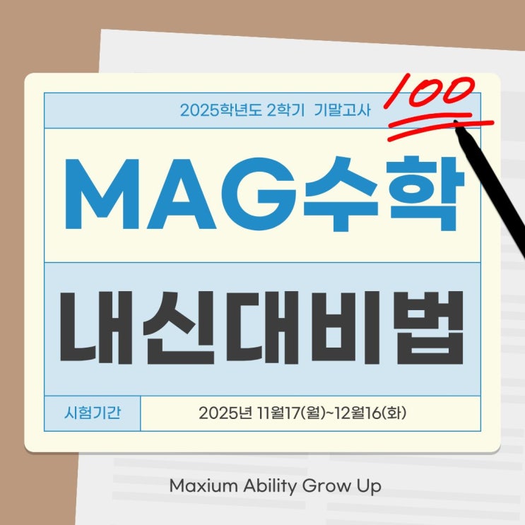 안녕하세요! 2025년 2학기 기말고사를 앞두고 4주간 중등수학 내신대비 프로그램을 안내드립니다. 4주 집중 내신 프로그램 + 토요일 주말보강 안내 우리 학원은 평소 정규수업에서 개념 4회독 시스템으로 개념 완성 → 내신대비교재 및 MAG기출10회 로 실전 적용까지 완성하여, 내신 기간에는 “가장 필요한 것만” 집중합니다. 학교별 기말고사 일정 안내 드디어 공개되었습니다…! 중등부 내신 일정이 발표됐습니다. 올해도 어김없이, 그날이 다가오고 있습니다. 시험일은 정해졌고, 이제 남은 건 준비뿐입니다. MAG학원에서의 기말고사 대비과정을 소개합니다. 학기과정 4회독 완성 내신대비 전에 교재 2회독 원칙으로 개념 및 유형학습....... <img src="https://blogthumb.pstatic.net/MjAyNTExMThfNjAg/MDAxNzYzNDQ1MjE0MzE2.__Q8kGLMqcR4FHfwMNOMTB35H2uXqsqbfGi94HRCpN8g.hdrQG-grlKAJKzz3nKaZq_cxW48W_Q0kNs5wgTpomX0g.JPEG/1.jpg?type=s3" />
