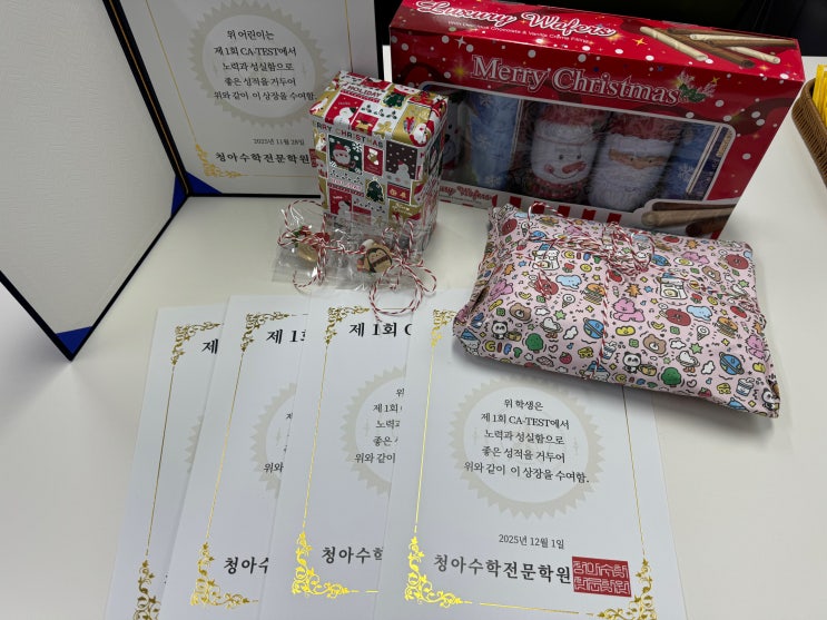 안녕하세요 은행동에 위치한 청아수학전문학원입니다. 청아는 한 달에 한 번 자체 시험을 통해서 학생들의 실력을 뽐낼 수 체크할 수있는 CA-TEST를 진행했습니다. 1등부터 5등까지 학생에게 가족들과 소중한 추억을 쌓을 수 있는 상품들을 시상하였습니다. 큰 시험은 아니지만 소수의 학생들이 다니는 학원에서 서로 좋은 동기부여를 받을 수 있는 이벤트입니다. 상을 받은 학생들은 더욱 열심히 할 수 있도록 격려하고 아쉽게 상을 받지 못한 학생들은 다음 시험을 기약해 또 열심히 노력해 보기로 했습니다 집중 모집 중. 1. 예비 중1A 수학반 (레벨테스트로 합류 여부 결정) 화/목/금 or 토 판서 수업 (정원 5명) (기본서-개....... <img src="https://blogthumb.pstatic.net/MjAyNTEyMDRfMjU3/MDAxNzY0ODMwNTc5NTYz.KQY7XWDvNMFthdhYQuD9Kt_YXpbgU3UwRRHnDaS3XEYg.sH-7moXhfciqgPk22AdaG77zQgglkXJoXd5B-dTLYocg.JPEG/%BB%F3%C0%E52.jpg?type=s3" />