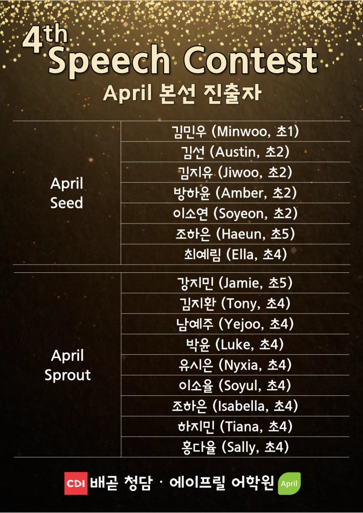 안녕하세요, 배곧 청담 & 에이프릴 어학원입니다. 지난 몇 주간 진행된 1차 원고 심사와 2차 예선 발표가 모두 마무리되었습니다. 참가한 모든 학생들이 보여준 열정과 노력 덕분에, 올해도 놀라운 수준의 스피치들이 탄생했습니다. 도전하는 마음을 잃지 않고 마지막까지 최선을 다해준 모든 학생들에게 감사와 격려의 마음을 전합니다. 이번 스피치 콘테스트는 많은 학생들이 자신의 생각을 글로 쓰고, 다시 말로 표현해보는 과정에서 큰 성장을 이루는 시간을 만들어 주었습니다. 발표자로서 무대에 오른다는 것은 누구에게나 쉽지 않은 도전이지만, 두 차례 예선을 끝까지 완주한 우리 배곧 청담 & 에이프릴 학생들은 이미 값진 경험....... <img src="https://blogthumb.pstatic.net/MjAyNTEyMDJfMjQ4/MDAxNzY0Njc4NjY2Mzk4.ZK9ey5pllWU9DTgqT5cZYqnChgp_PiNYS2i2xWwAZWAg.5OuaUPS6ACrONosWNt3eNZ0PRM9bBoTs6hSCOumvPUsg.JPEG/%BD%BD%B6%F3%C0%CC%B5%E51.JPG?type=s3" />