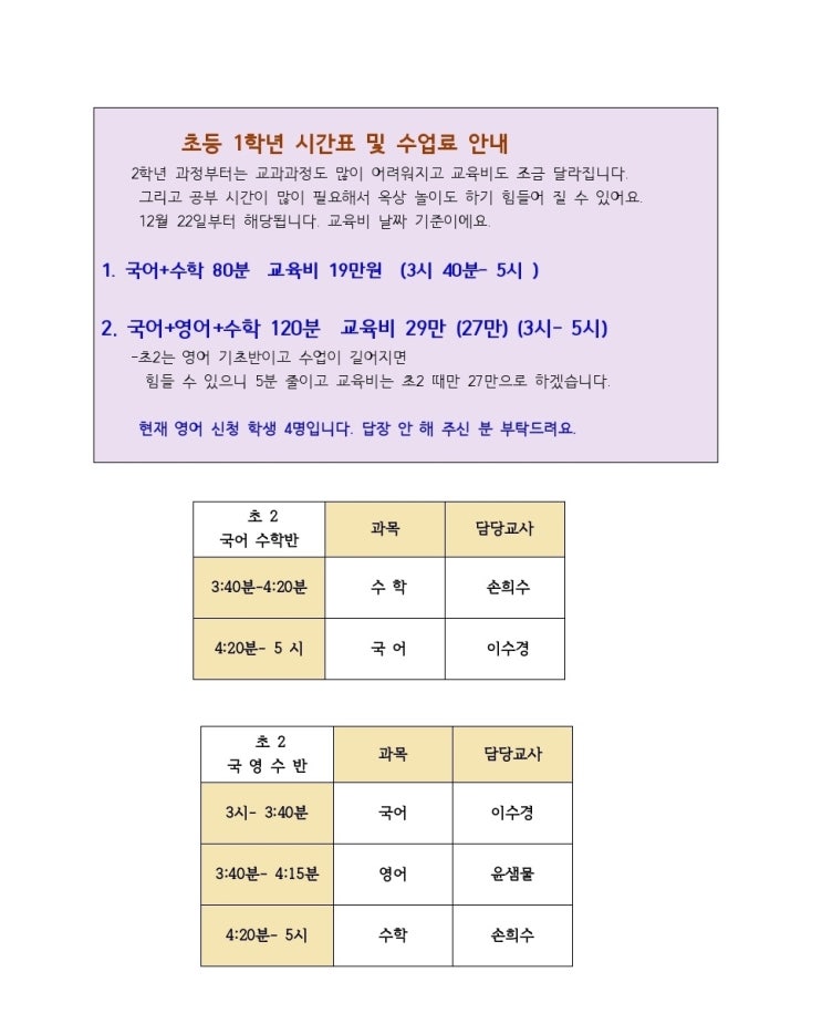 안녕하세요? 신천고 학기말 고사가 끝나면 바로 이어서 2025년 12월 22일 부터 새학년 수업으로 시간표가 적용됩니다. 이에따라 학년마다 변동되는 과목이나 시간등이 새롭게 적용되는 학년들이 있답니다. 초1-2학년을 위한 저학년 영어 파닉스반이 새롭게 개설되며 초2는 초 3부터 영어과목이 새롭게 개설됩니다. 초3-초 5학년은 현재와 같은 시스템으로 이어짐에따라 기존 수강료에서 2026년 1월부터 1만원씩 인상되게 되지요. 교육청에서 2025년 7월 1일자로 개정된 수강료표를 가지고 계산해보면 계몽학원의 교육비는 최고 받을 수 있는 수강료보다 20여만원 저렴하게 책정되고 있습니다. 우외~~ ~ 원장님도 대단하십니다. 어떻게 그동안 이....... <img src="https://blogthumb.pstatic.net/MjAyNTExMTdfMTgg/MDAxNzYzMzcwOTMwNTMy.6liLb-remqwn8U5Zd8SeiKXPW39w1xOTHO6aH9hvzJkg.-vOc3F8-lv8_KpoHANDcSLkjtoF7ZF0YNmyn6x1v5m0g.JPEG/1_2%C7%D0%B3%E2_%BF%B5%BE%EE%B9%DD%B0%B3%BC%B3.jpg?type=s3" />