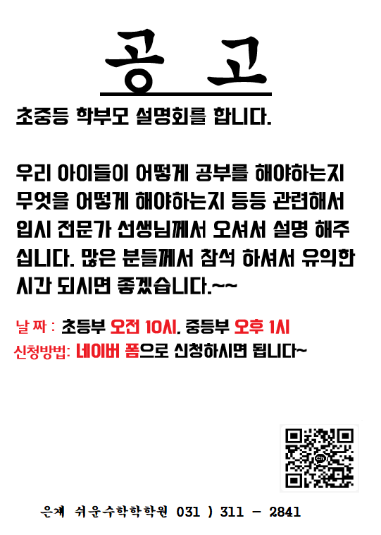초등부, 중등부 설명회를 하게 되었습니다~~~ 함께 하는 것이 아닌 시간을 나눠서 각각 진행합니다. 참석하셔서 유익한 시간이 되실 바라는 마음으로 준비했습니다. 신청은 네이버 폼으로 신청해주시면 됩니다. https://naver.me/xcAlCHDg <img src="https://blogthumb.pstatic.net/MjAyNTEyMDNfOTcg/MDAxNzY0NzY0OTM4ODg5.YP5vfX0fy3dXY89tiaGbzzMKi0i7ETXIzjlV4DYyeIQg.CJUcRLsHdjmZd13w50m5iwn7AUA5SugZ8-NOQ3z1O9Qg.PNG/%C0%D4%BD%C3.png?type=s3" />