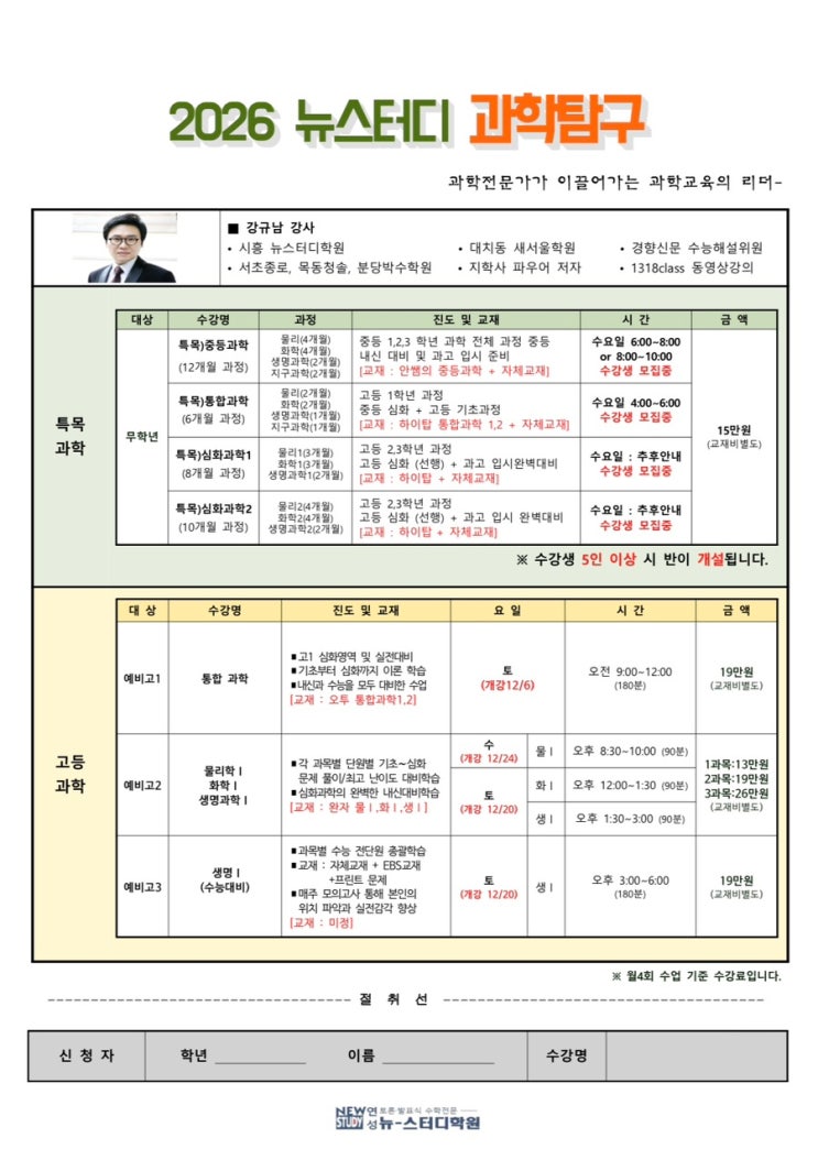 2026 뉴스터디과학 수업 및 개강안내 탄탄한 커리큘럼과 안정적인 성과로 꾸준히 선택받는 뉴스터디과학! 늘 시작이 중요하듯 이번 12월, 뉴스터디에서 ‘과학교육의 리더’ 강규남 선생님과 시작을 함께 할 수 있는 좋은 기회입니다! 수업에 관련된 자세한 내용은 아래 안내문 참고 부탁드립니다 :) 특목과학반 (무학년제) 2026 특목과학반이 신규 개설됩니다! 무학년제로 중등과학부터 고등심화과학까지! 특목고 입시 대비에 최적화된 커리큘럼로 준비되어 있습니다! 현재 수강생 모집 중에 있으니 많은 관심 부탁드립니다. 고등과학반 (예비고1~3학년) 기초부터 심화까지 내신 완벽 대비! 학기 중에는 수강 문의가....... <img src="https://blogthumb.pstatic.net/MjAyNTEyMDVfMTY1/MDAxNzY0OTI3MDI1NzYy.Tvd6vuqaemHO_mrjkJRJL-XB04FtcZ4sdkPvLQMH4Zkg.SX3RHfgN1Z22etd9Yn1N4JnkFce7G1wDaaiqQAXXC8og.JPEG/IMG%A3%DF6014.jpg?type=s3" />