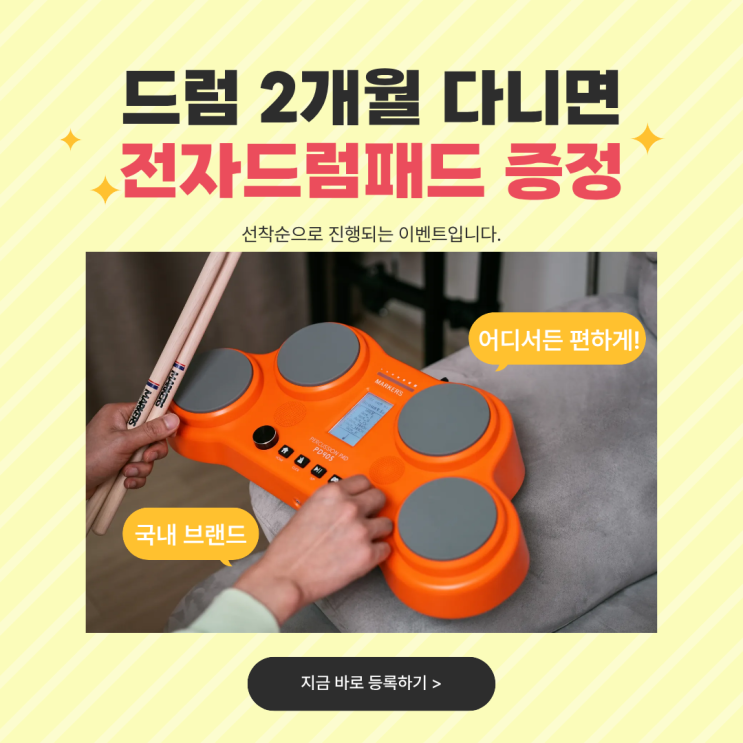 이번 겨울, 드럼이라는 새로운 취미를 선물해 보세요 로드실용음악학원 전자드럼패드 증정 이벤트 어느새 겨울입니다. 날씨는 점점 더 차가워지고, 학교는 방학을 앞두고, 어른들은 한 해를 정리하며 새로운 계획을 세우게 되는 계절이죠. “이번엔 뭔가 하나 제대로 배워보고 싶은데…” “아이랑 함께 할 수 있는 취미가 있으면 좋을 텐데…” “스트레스 좀 시원하게 풀 수 있는 게 없을까?” 이런 생각이 드셨다면 이번 로드실용음악학원 드럼 이벤트, 정말 좋은 기회가 될 수 있어요. 드럼 배우면, 집에서도 연습할 수 있게 도와드려요 이번에 준비한 이벤트는요, 드럼 수강 2개월 등록 시 전자드럼패드를 무료로 증정해 드리는 이....... <img src="https://blogthumb.pstatic.net/MjAyNTEyMDhfMjE2/MDAxNzY1MTgzOTc4MzY0.zSeVUC4T0gI_uGiWEsnK_O0awLxrLzXwkiziGQ4LXH4g.wHR_YJ-cS-bO2DopEv32clxNiepnj_CSOMy9iB7Y46Qg.PNG/%C1%A6%B8%F1%C0%BB_%C0%D4%B7%C2%C7%D8%C1%D6%BC%BC%BF%E4_%282%29.png?type=s3" />