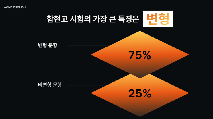안녕하세요. 함현고 전문 아크메 셀리움 영어학원입니다. 지난 포스팅에 이어 오늘은 함현고 영어시험의 특징 중 '변형'과 '모의고사'와의 연계성에 대해서 다뤄보고자 합니다. 지문은 얼마나 변형될까? 함현고의 영어시험에서는 전체 문항 중 약 75%의 문항이 변형되어 출제가 됩니다. 즉, 일부 문항을 제외한 대부분의 문항들이 변형됩니다. 어떻게 변형될까? 작년 함현고 1학년 시험은 변형의 비율은 높았지만, 체감 난이도는 높지 않았던 시험이었습니다. 변형 어휘는 고1 수준을 크게 벗어나지 않았으며 지문의 핵심 내용과 중심 문장을 변형하여 출제하는 방식이 주를 이루었습니다. 즉, 단순 암기가 아닌 지....... <img src="https://blogthumb.pstatic.net/MjAyNjAyMjVfMjI2/MDAxNzcyMDI0NDM0MDY5.YesOlbIwwzs47RzzXOJlKbCpYkm5dwCRf3GODvzBPGUg.6QINoLzLVfeBa0TokLi3IpLt-2Qh4bRr4FBu68jA4Xkg.PNG/image.png?type=s3" />