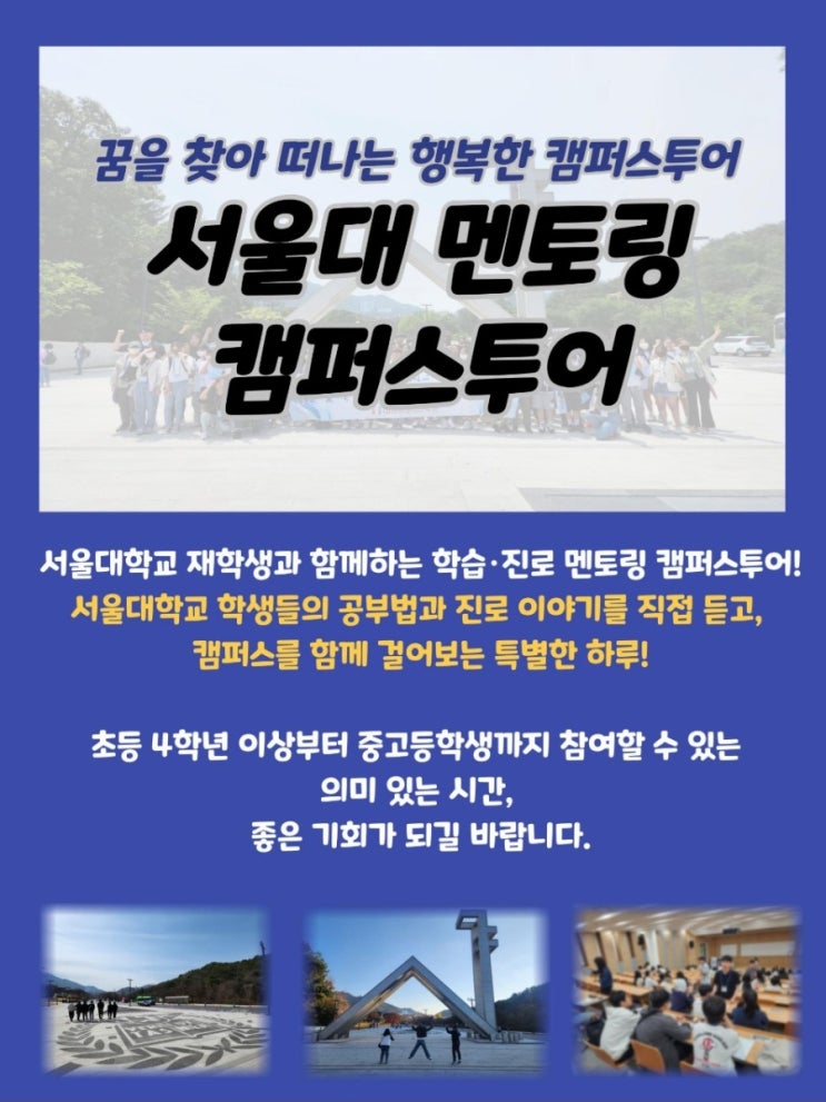 안녕하세요 잉글리시아이 장현풍경채점입니다:) 이번 잉글리시아이에서 안산과 시흥 지역에 있는 원장님들과 함께 아이들에게 공부 동기부여를 하고자 서울대 멘토링 캠프에 학생들을 초대합니다. 저역시 자녀를 키우고 있는 학부모라 대학 멘토링 캠프에 늘 관심을 가지고 지켜보고 있었습니다. 확실히 한번 다녀온 학생들도 궁금했던 대학 생활과 공부의 방향성에 대해 도움을 받고 왔다는 후기가 많습니다. 관심있는 학부모님께서는 저에게 편하게 문의주세요. 일시: 12월6일 장소: 서울대캠퍼스 참가신청대상: 초4~중3 참가비:점심 식사비, 교통비포함(보험가입) ( 버스 대절-학원 앞에서 탑승 후 학원 앞에서 하차) 10만원 * 단체 신청이라....... <img src="https://blogthumb.pstatic.net/MjAyNTExMjVfMTU2/MDAxNzY0MDgwMDYyMDE3.OJncND1k4VWkOeeh9qQX3EP1lRo7-8ooRubqb_FpXeEg.CZwCo6vo124wTzD2ZjI3fbf1gYKm0EE5LF6IBXhKsI4g.JPEG/900%A3%DF1764080050180.jpg?type=s3" />