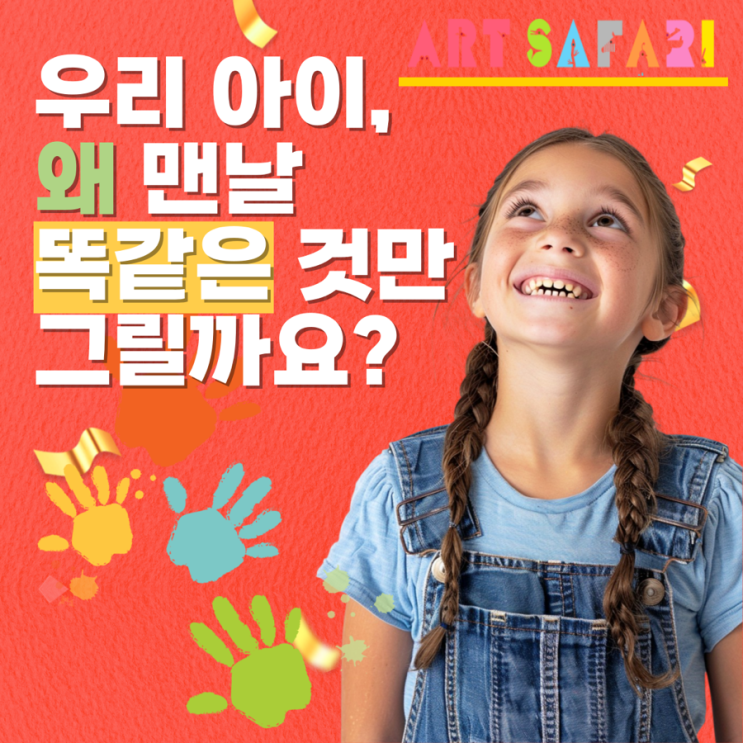아이의 그림을 바라보다 보면, 가끔은 “왜 늘 똑같은 것만 그릴까?” 하는 궁금증이 스치곤 합니다. 아이가 맨날 똑같은 것만 그리는 이유 안심하셔도 되는 *‘아주 자연스러운 단계’*랍니다. 아이들 중에는 무지개만, 공룡만, 공주만, 로봇만… 늘 같은 것만 그리는 시기가 꼭 찾아와요. 많은 부모님들이 “왜 자꾸 이것만 그릴까?” 걱정하시지만, 사실 이는 **성장 과정 중 하나인 ‘도식화 단계’**예요. ‘도식화’란 간단히 말해, 아이 머릿속에 자신만의 세계가 단단하게 자리 잡기 시작하는 시기입니다. 그래서 그 익숙한 이미지를 반복하며 더 깊게 탐색하죠. 그리고 놀라운 점은, 아이가 “이 세계를 내가 충분히 표현했어!”라고 느....... <img src="https://blogthumb.pstatic.net/MjAyNTEyMDNfMTM1/MDAxNzY0NzU0MDI2OTcw.QAkzTo2dVarMUHkZSHiV05Tk7mI-sZwywqQH6meOF7Yg.7q61e2tQoKHm86sovESqE-8-S7izNKODsu0St8oOp1wg.PNG/IMG%A3%DF0452.PNG?type=s3" />