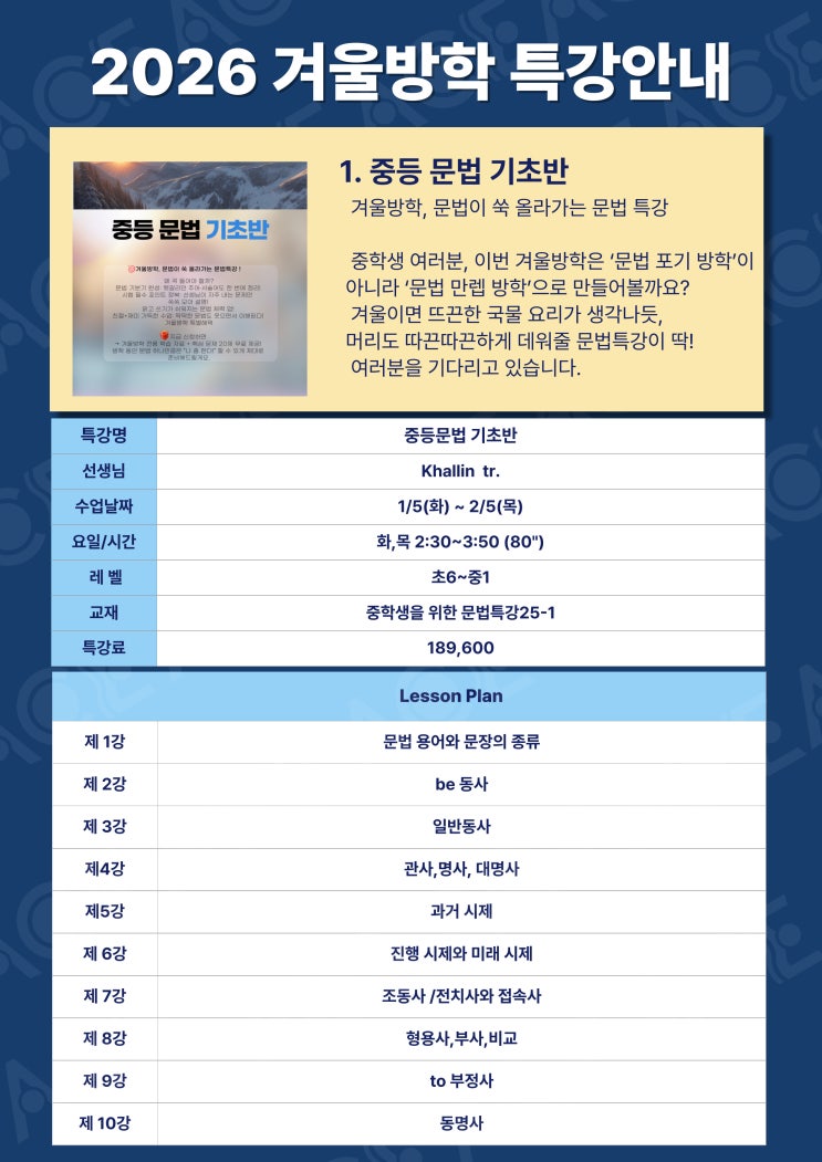 이번 겨울, 영어 실력의 '기준'을 바꾸는 시간 중학교 영어는 '감각'으로 풀 수 있는 과목이 아닙니다. 문법의 체계, 독해의 논리, 어휘의 깊이가 곧 성적의 격차로 이어지는 시기입니다. '불안한 영어'에서 확신 있는 영어'로 바뀌는 전화점을 만들어줄 겨울방학 특강을 안내합니다. ☃️2026 겨울방학 특강☃️ 특강기간 : 26.1/5(월) ~ 2/5(목) 총 10회 재원생 신청기간 : 25.12/3(수) ~ 12/10(수) 비재원생 신청기간 : 25. 12.11(목) ~12.18(목) 대상 : 중등 재원생 및 비재원생 신청방법 : 링크 접속 & 원내 문의 ☎️ 032-344-8959 https://forms.gle/e6tfBRFMab31nqXD7 <img src="https://blogthumb.pstatic.net/MjAyNTEyMDVfMyAg/MDAxNzY0OTA4MDQ0Mzkw.bPgxGLRywMcVbPwkIfcl0aI3DvvVgYz66ePQQgFH_qMg.h6q-xaI_gXvwPyR_iGfsi8vdEgfJ53E7aqrXrwQJ8VAg.JPEG/003.jpg?type=s3" />