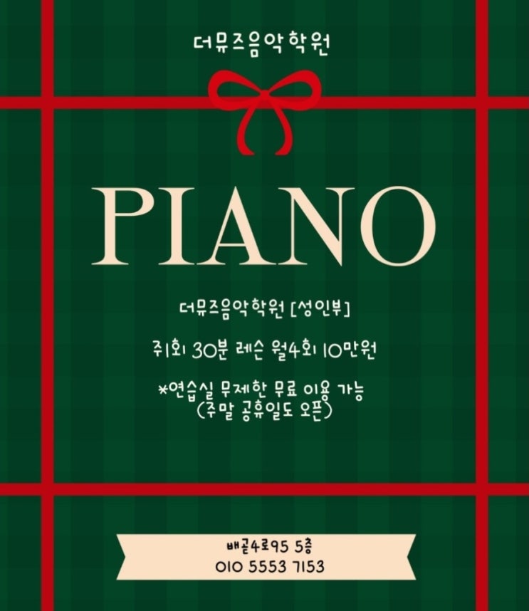 안녕하세요 더뮤즈음악학원 입니다 더뮤즈음악학원 성인반 안내드립니다! 월 10만원 주1회 30분 레슨 월4회 연습실 무제한 이용 가능 :) 재즈 | 클래식 | 뉴에이지 | 반주법 등 다양한 장르 티칭 가능 합니다. 자세한 내용은 010 5553 7153 으로 연락주세요 제시882호 기초15만원 #배곧성인피아노 #배곧성인피아노레슨 #배곧신도시성인피아노 #배곧피아노레슨 #배곧성인피아노학원 #배곧성인피아노학원추천 #배곧성인취미 #배곧피아노레슨 <img src="https://blogthumb.pstatic.net/MjAyNjAyMjRfNiAg/MDAxNzcxOTAwMDQyOTQ5.6z7ZYTgu-FKQ7xjxVhd42ww54oXV2F-eWwukeiwbJ9Mg.AuPR-xGfB67HxalfQTcyRQU5vG7E-9C-asAtNMCes8Mg.JPEG/900%A3%DF1771900041993.jpg?type=s3" />