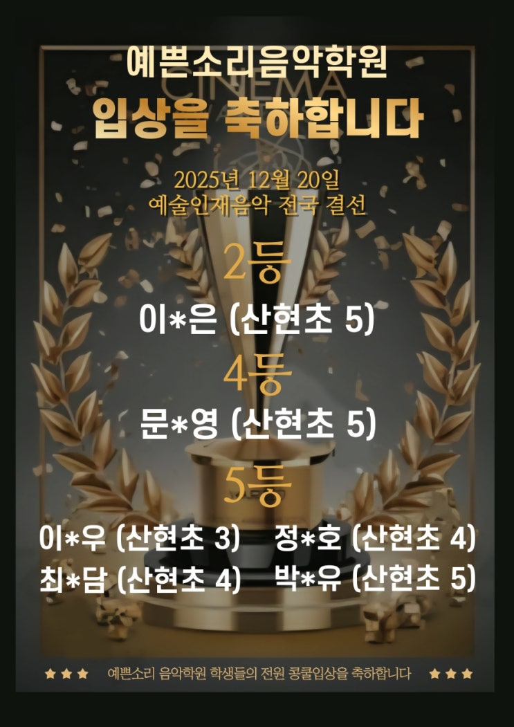 2025년 12월 20일에 총신대에서 진행된 예술인재음악콩쿠르 전국 결선에 울예쁜소리둥이들 참가했어요 각지역의 대상.예술대상.준대상 친구들이 모여서 콩쿠르를 진행하였는데.. 인원이 어마무시 했어요 오전부터 시작해서 저녁 10시정도에 끝난듯해요 경연을 기다리는 아이들이 얼마나 오랜 시간동안 마음을 졸이면서 긴장을 했을지... 이번 겨울의 독감으로 인해 유독 결석친구들이 많아서 걱정했는데요 그래도 무대에서 잘 연주하고 내려와준 예쁜소리제자들 기특합니다 예술인재음악콩쿠르 전국결선은 2025년도 부터 지정곡으로 각지역의 대상.예술대상.준대상 친구들이 모여서 콩쿠르를 진행하였는데.. 인원이 어마무시 했어요 오전부터 시....... <img src="https://blogthumb.pstatic.net/MjAyNjAxMDFfMjAx/MDAxNzY3MjUzNjQ1NTEx.tI8qpSWKqhUb8EVHB7XOv2gpw_IIlT4R6QE2EsTF5hYg.utQxiFOU7UVqenRFi9r0OZK6eEE8xPCO4RtgunVaS8Yg.JPEG/1767252786967.jpg?type=s3" />