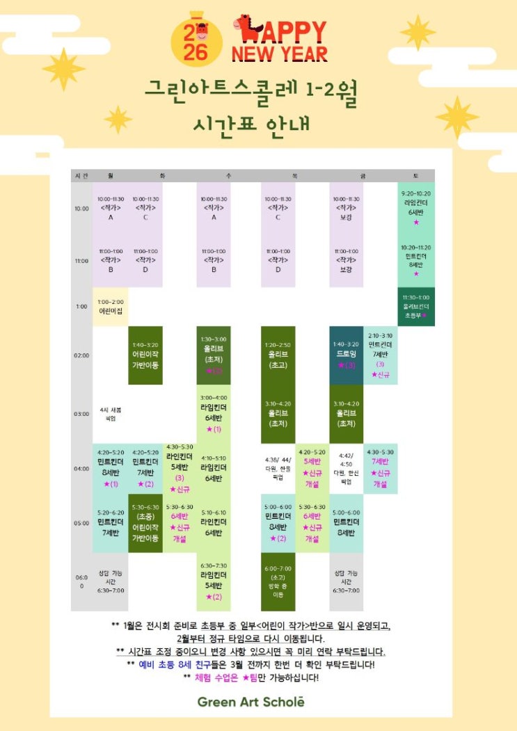그린아트스콜레 시흥 배곧 2026년 1-2월 시간표&일정표 안내