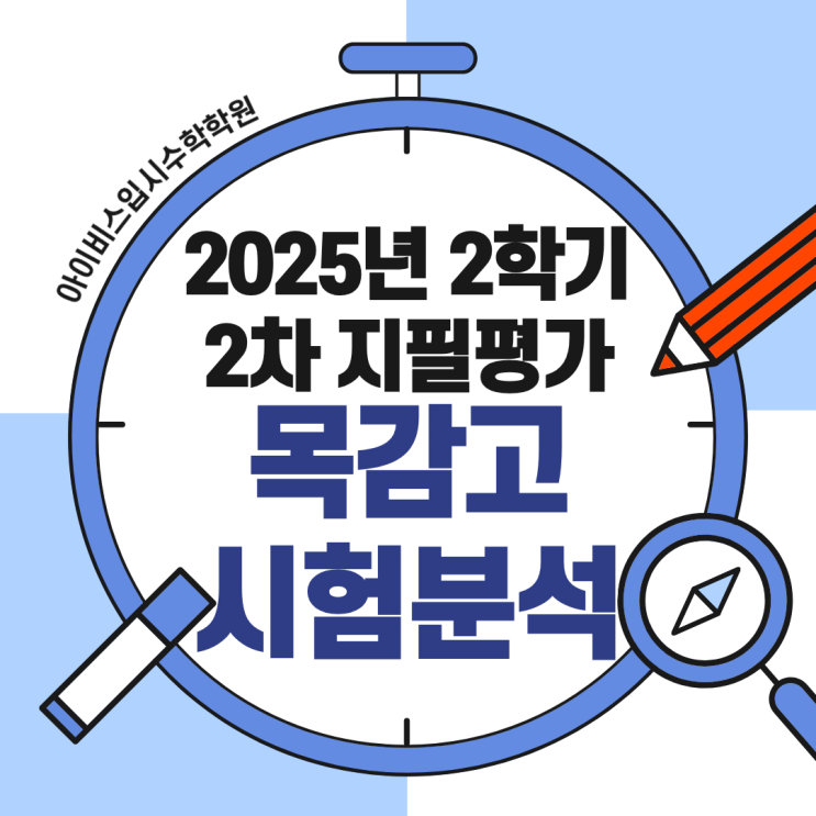 제시 1208호 안녕하세요. 아이비스입시수학학원입니다:) 2025학년도 마지막 시험이 12월 16일부로 마무리되었습니다. 이번 기말고사는 어떻게 구성되었고, 난이도는 어땟는지 분석한 결과를 알려드리도록 하겠습니다 :) 목감고등학교 1학년 2학기 기말고사 시험분석 목감고등학교 1학년 2학기 2차 지필평가는 객관식 20문항과 논술형 2문항, 총 22문항으로 구성되었습니다. 시험은 초반부에 기본 개념을 묻는 비교적 쉬운 문항으로 시작해, 중⦁후반으로 갈수록 난이도가 점진적으로 상승하는 선형적 난이도 구조를 보였습니다. 전체적인 난이도는 중상 수준으로 평가됩니다. 체감 난이도는 지난 1차 지필평가와 큰 차이는 없었으나, 제한된 시간....... <img src="https://blogthumb.pstatic.net/MjAyNjAxMDhfMzcg/MDAxNzY3ODUzMTg2MjAw.qUANyaov7CSYwByn7GrRUU2oouwhyGjiKY49xrKuBl0g.KSis3H7wD7dI-J4pr01o_8-zRy1zCy7gZXW-jzuTMigg.PNG/%B8%F1%B0%A8%B0%ED.png?type=s3" />