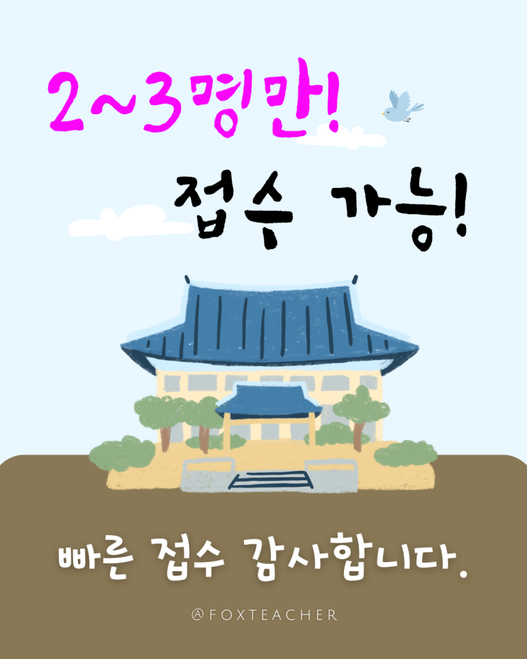 안녕하세요. 여우샘입니다. 아직 날짜가 여유가 있는데.. 접수 속도가 조금(?) 빠릅니다~^^ 밤 수업이기에 적정 인원으로만 진행합니다. 그리고 역사논술지도사는 차시도 좀 길고 재료가 매주 있어 재료 준비가 만만치 않아 자주 하지 못하는 강좌이기도 합니다. 학기 중에 개강하는 강좌라 재료 준비로 걱정했는데 빠르게 접수해 주셔서 미리 준비할 수 있어 너무 감사드려요. 어려운 암기식 역사가 아닌, 아이들과 유익하게 수업하실 수 있도록 시대 흐름 짚어보고 역사논술 독후 활동 팁을 수업 시간에 알려드립니다. 재미있는 이야기 들으신다고 생각하시고 참여해 보세요. ^^ 자세한 수업 안내는 아래 링크에서 확인해 주세요. https://blog....... <img src="https://blogthumb.pstatic.net/MjAyNjAyMTBfMzYg/MDAxNzcwNzE5NTI5OTcz.ejTERI8fdR8m6y2sd-dcMs5WkJ-WEyBhPTo22t2WI74g.GQOatL0N_-9SJ1NKMjFwZ0kMjou79agYoEfGUBhIQTsg.PNG/foxteacher_%2812%29.png?type=s3" />