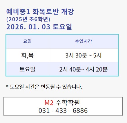 안녕하세요 M2 수학학원 입니다. 2025년도 현재 초등 6학년 (예비중 1) 문의가 많아 기존 월수금반 외에 화목토반 개강 소식을 알려드립니다. 중등 1학년 1학기 첫 시작반으로 판서식 수업 100분 + 첨삭 100분 수업입니다. +기존 월수금반도 안내드립니다. 차량운행은 하고 있지 않습니다 ^^ 배곧 도서관 맞은편 롯데리아, 농협, 라온 소아과 건물 5층입니다. 상담문의 031- 433- 6886 <img src="https://blogthumb.pstatic.net/MjAyNTEyMjBfMTQ5/MDAxNzY2MjExMzgxODE4.FjdEZ1St4xOfQO-M8dntdA7E7EexXj9gRExaZJgWLGUg.XP7IkIhPXOg-q3doywVS-Bcyf9MFji2DGf9hqjO6ihUg.JPEG/%BF%B9%BA%F1%C1%DF1.jpg?type=s3" />