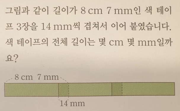 초등 수학에서 아이들이 가장 많이 틀리는 “겹치는 길이 문제”를 한 번에 정리해드립니다 초등 수학 꿀유형 리본 겹치기 문제 완벽 정리! 아이들이 은근 많이 틀리는 유형이 있어요 바로 리본을 겹쳐 이어 붙이는 문제입니다! ✔️ 핵심 개념 리본을 이어 붙일 때는 겹치는 부분이 중복되기 때문에 한 번 빼줘야 합니다. 공식 전체 길이 = 두 리본 길이의 합 − 겹친 길이 --- ✔️ 예시 문제 문제 1 길이가 12 cm인 리본과 9 cm인 리본을 이어 붙였습니다. 겹치는 부분이 3 cm일 때, 전체 길이는? 풀이 12 + 9 − 3 = 18 답 18 cm --- 문제 2 길이가 15 cm인 리본과 8 cm인 리본을 겹쳐 붙였습....... <img src="https://blogthumb.pstatic.net/MjAyNjAzMjRfMTk4/MDAxNzc0MzEyOTMzOTg1.oQ8n_hlZ5u-UDfUOs8e-VIPHsUj1SGM-6u1CagjgPLsg.HzRi_-suRZe-RVCqsIQTnRJyVyv_9CugEXQt9ruWwIAg.JPEG/1774312932858.jpg?type=s3" />