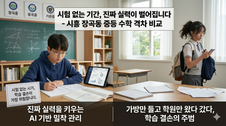 안녕하세요. 수학과 문해력 교육으로 아이들의 사고력과 학습역량을 키워주는 분석수학문해력학원 (구 책통클럽하마수학)입니다 시흥시 장현지구 장곡동에서 초등수학, 중등수학, 교과서독해력, 비문학독해력, 인문학특강, 수학경시대회대비를 교육합니다. 시흥시 장곡동 학부모님. 장곡중, 응곡중, 가온중 등 우리 지역 중학교들은 1학기 1차 지필평가(중간고사)를 실시하지 않습니다. 시험이 없으니 아이들은 여유로워 보이지만, 역설적으로 이 시기가 중등 수학 성적의 빈익빈 부익부가 결정되는 시기라는 사실, 알고 있으신가요? 시험이라는 객관적인 점수가 나오지 않는 지금, 우리 아이가 정말 잘하고 있는지 불안하시다면 분석수학의 데이....... <img src="https://blogthumb.pstatic.net/MjAyNjAzMjRfNjEg/MDAxNzc0MjkwODE0NzU0.blEcLW7jK2-uk6Wwd2BH4fGlDdW1MUU_RP2Pos4BpQUg.iOcpohayGBZv0lZ5evjEKhKN4DRiPWEEWrb3jPviJTQg.PNG/900%A3%DF1774290802920.png?type=s3" />