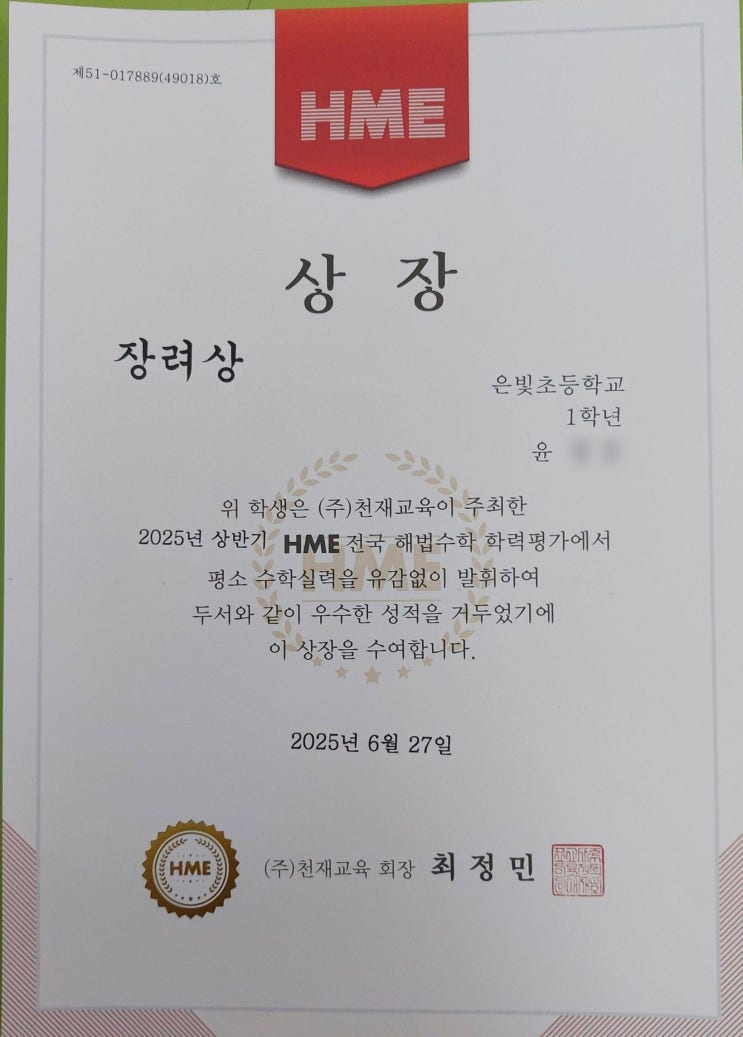 2025년 상반기 HME 수학경시대회를 통해 학생들의 수준과 학습방향을 분명히 확인할 수 있습니다. 안녕하세요! 시흥 은행동 은계지구에 위치한 1타수학전문학원입니다. 지난 8월에 마무리가된 초등부 HME 수학경시대회 결과를 이제야 포스팅을 하게 되었습니다. 시험을 치르고 나면 언제나 느끼는 것이 있습니다. 단순히 문제를 많이, 열심히 푸는 아이가 성적이 높게 나오는 것이 아니라 한 문제라도 꼼꼼하게 제대로 공부하는 아이가 좋은 결과가 나온다는 것입니다. 이번 시험은 한 명을 제외하고는 초등 전원이 처음으로 시험을 보게 되었습니다. 그렇다보니 긴장도 많이하고 실수도 많았던 것 같습니다. 그래도 평소에 침착하고 꼼꼼하게 공....... <img src="https://blogthumb.pstatic.net/MjAyNTEyMjhfMTc2/MDAxNzY2ODc1NTcxNDI2.BA4OU-fCJfKiA40tkMOAb0UzzRt-8A57iFvUpfVPkNwg.VxOdoMLQpBwDaG3lX0hRa63LZRW8ePwlV_s3H_9eEFUg.JPEG/20250804_160039.jpg?type=s3" />