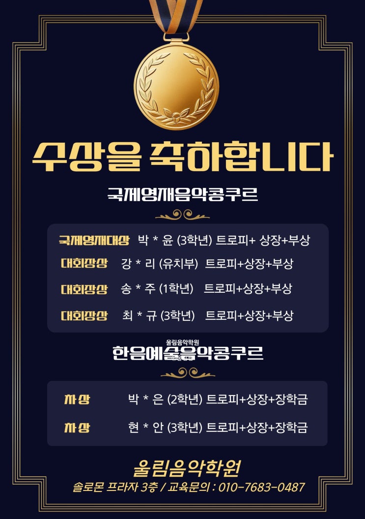 안녕하세요. 배곧 라온 초등학교, 배곧 초등학교 학생들의 음악 학원. 울림음악 학원 원장 울림쌤입니다. :) 오늘은 자랑스러운 울림이들에 대해 적어보려고 해요. 2025년 한 해, 울림음악학원 아이들이 모두 콩쿠르에서 빛나는 성장을 보여주었습니다. 울림음악학원에서는 상, 하반기 아이들의 성장을 도모하기 위하여 콩쿨반을 운영하고 있는데요. 오늘은 한 해 울림음악학원 콩쿨반 아이들의 모습을 회고하며 글을 적어보겠습니다. 아이들의 선택이 모인 콩쿨반 저희콩쿨반은 전적으로 "아이의 선택"에 맡깁니다. :) 부모님이 원하셔도, 아이가 원하지 않으면 참가할 수 없습니다. ★ 아이가 하고 싶어야 참여할 수 있습니다. ★ 그....... <img src="https://blogthumb.pstatic.net/MjAyNjAxMDVfNiAg/MDAxNzY3NTg0MTMxOTg2.wmUU2GsF0k041U5bDGwEEJFeqoUO6ELFn4lAvKnnZJgg.knnQrHH-7BszGCauOpcyNo9VAftMiK7B-Oq5VgCOe64g.JPEG/%C1%A6%B8%F1%C0%BB_%C0%D4%B7%C2%C7%D8%C1%D6%BC%BC%BF%E4._%281%29.jpg?type=s3" />