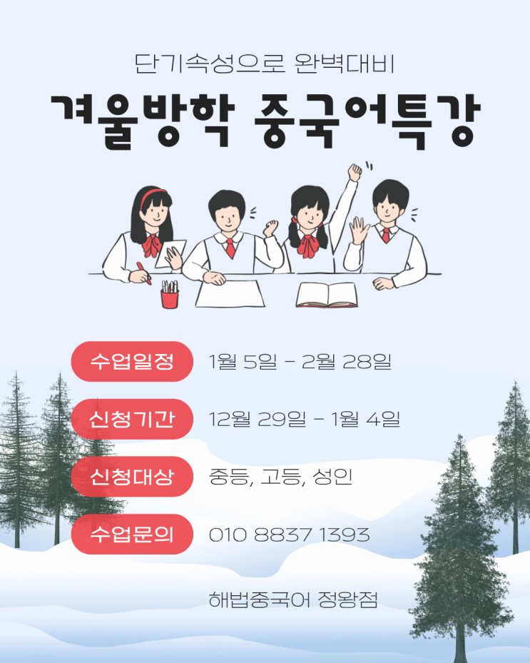 따쨔하우! 시흥시 정왕동 영남 1단지 상가동에 위치한 중국어, 한자 전문학원입니다. 이번 주부터 겨울방학이 본격적으로 시작되네요. 중국에서 무비자 입국이 실행되면서 많은 분들이 중국어에 큰 관심을 가지게 되었어요. 우리 학원에서는 겨울방학을 맞아 알찬 방학 특강을 준비했어요. 수업 시간 및 내용 수업 내용 교육상담: 010 8837 1393 교육내용 입문, 회화, 내신대비, tsc, hsk 급수한 자 교육대상 초등, 중등, 고등, 성인 교육시간 월, 수 오전 월~금: 14시~20시 토, 일: 오전 교육문의 010 8837 1393 #중국어 #겨울방학특강 #단기속성 #hsk자격증 #완벽대비 #정왕동중국어학원 #성인중국어 #초등중국어 #중고등내신중국어 #기업체출....... <img src="https://blogthumb.pstatic.net/MjAyNjAxMDJfMjA4/MDAxNzY3MzI5NTg1Mjk2.L40SpmnuQLZX-j1Pu_Y_0fncNq5gLI_K-pV4z_tUC7Eg.9hx519nwcjxK_RzLzMLdoiwSPOt47FMj-fKdCHg3lSwg.PNG/2025%B3%E2%B0%DC%BF%EF%B9%E6%C7%D0%C6%AF%B0%AD.png?type=s3" />