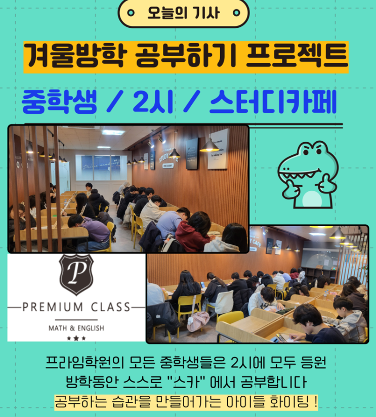 프라임학원 중학생들이 겨울방학 공부하기 프로젝트를 시작하였습니다 겨울방학동안 집에만 있으면 너~무~ 지루해 (휴대폰하고 놀기만해) 그래서 매일 2시에 등원하여 스카에서 공부나 해보자~ 겨울방학 하루종일 휴대폰 (유튜브,게임) 하다보면 하루가 빨리도 간다 ㅠㅠ 시간이 빨리도 간다 ㅜㅜ <img src="https://blogthumb.pstatic.net/MjAyNjAxMTFfMjMz/MDAxNzY4MTA1MzA2OTA3._wqki2OS5dsDdlOha7JyVwj_DdOhzh8Ue52sgU7LBDcg.1U0p6UEhkHMeGd6hQD1qLTqfCQA4zq4fUGHkNCXx6K4g.PNG/%BD%BA%C5%A9%B8%B0%BC%A6_2026-01-11_132010.png?type=s3" />