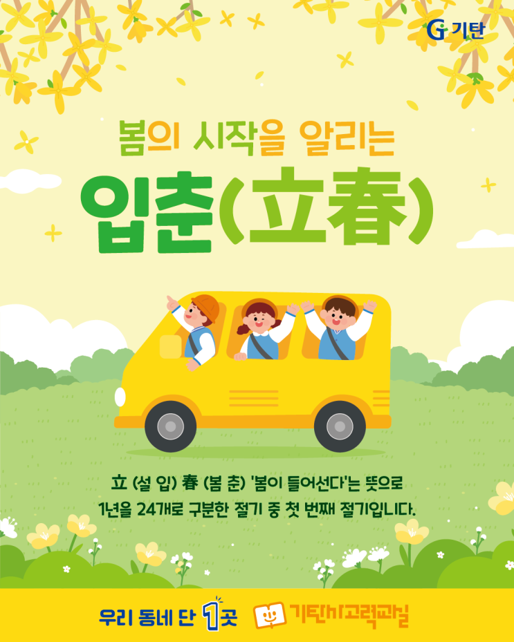 입춘은 스물네 절기 중 첫 번째 절기로 ‘봄이 시작되는 날’을 의미합니다. 날씨는 아직 차갑지만 자연은 서서히 변화하기 시작합니다. 유치, 초등 저학년 아이들에게 '왜 입춘이 봄의 시작일까?' 질문을 건네면 계절에 대한 이해와 관심을 자연스럽게 이끌 수 있습니다. 입춘 즈음에는 낮의 길이가 조금 늘어나고 햇빛이 부드러워지는 등 아이들이 직접 관찰할 수 있는 변화가 나타납니다. 집 주변을 함께 걸으며 “요즘에는 낮이 좀 더 긴 것 같지? 입춘이라서 그런 거야, 입춘이 뭐냐면~” 이런 대화를 아이와 주고받다 보면 아이도 직접 자신이 관찰한 내용을 말로 표현하는 경험이 쌓이고 자연에 대한 흥미도 높아집니다. 입춘 무....... <img src="https://blogthumb.pstatic.net/MjAyNjAxMjhfNTcg/MDAxNzY5NTU5NzUwMDQ4.GKaWWiodgfecZbAB9dvBl5F2BP_HKuYn8s4QzqbLxOgg.nsszK75R3SAiB_0KuwHjZw-3sYlE_eYhJdYomYf8Kzwg.PNG/1월_입춘_1.png?type=s3" />