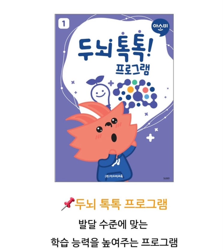 유치•초등 사고력 프로그램 찾고 계신다면? 아소비 두뇌톡톡 수업 소개합니다 :) 요즘 학부모님들과 상담을 하다 보면 이런 말씀을 많이 하십니다. “문제집은 잘 푸는데 생각하는 힘이 부족한 것 같아요.” “공부를 억지로 시키지 않고 재미있게 할 수 있는 방법 없을까요?” 그래서 많은 학부모님들이 관심을 가지시는 프로그램이 바로 아소비 두뇌톡톡 프로그램입니다. ⸻ 두뇌톡톡 프로그램은 어떤 수업일까요? 두뇌톡톡은 단순히 문제를 많이 푸는 공부가 아니라 아이들이 활동을 통해 사고력과 두뇌 자극을 하는 프로그램입니다. 수업에서는 ✔ 규칙 찾기 ✔ 비교와 관찰 ✔ 논리적 사고 ✔ 추리 활동 ✔ 사고력 문제 해결 같은 다....... <img src="https://blogthumb.pstatic.net/MjAyNjAzMTRfMzkg/MDAxNzczNDg2MDI0NDc4.GX7e_uXD9NR_qDjJmciFPkAbEJKvf8Bqqe-Hn_Lv4QEg.rwHnCdzJ91e9faT6hxFmWLWqh0dS2a09S3V_GmAh1OEg.JPEG/IMG%A3%DF4283.jpg?type=s3" />
