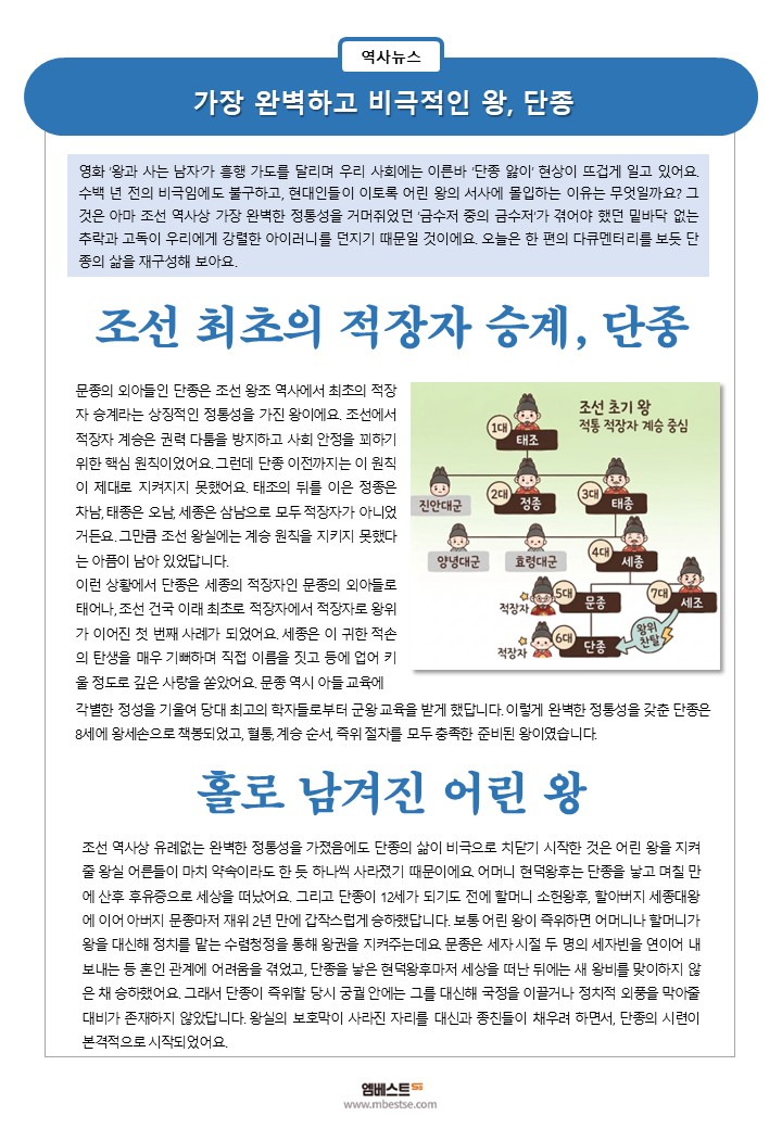 엠베스트SE 본부에서 제공하는 역사뉴스!! 이번에는 왕과 사는 남자, 단종 입니다. 솔직히, 중3, 역사2(한국사) 지필평가에서 단종이 등장한 적은 많지 않습니다. 하지만, '왕사남' 여파로 나올 수도?? ^^;; (그냥 저만의 생각입니다.) <img src="https://blogthumb.pstatic.net/MjAyNjAzMTZfMTIw/MDAxNzczNjcxOTA2MzE5.DL_zDzWLdroJdnQYCAlmsT1reBmtvH01CPzmEPw7WRog.RQLQq3BUVdb6oHkM_kvWQgjKkdpJaFoMhllfYXPzShEg.JPEG/%BD%BD%B6%F3%C0%CC%B5%E52.JPG?type=s3" />