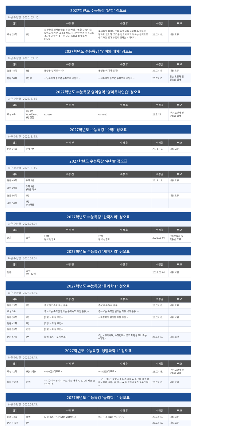 2027 수능특강 과목별 정오표