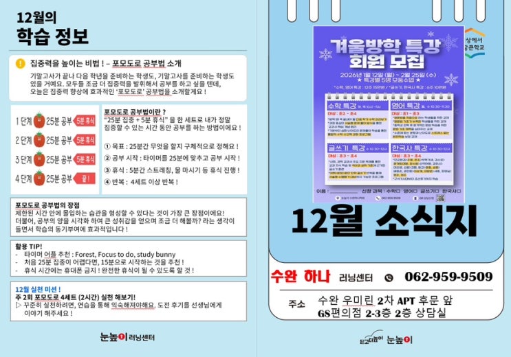 2025년 12월 눈높이 수완하나센터 소식입니다. 2025년 12월 눈높이 수완하나센터 주요일정입니다. 문의사항은 아래 주소로 연락 또는 방문주세요 <img src="https://blogthumb.pstatic.net/MjAyNTEyMDhfMjIz/MDAxNzY1MTcyNjg4NTc1.GHdAQGaco_AwIfOHAmMs5z6y4L18tUQe0prX7GBRk0Ag.hvD9AwVLJQOxTPLlbKm-SIwdWerLERY6nQUScq4e-hUg.JPEG/IMG%A3%DF8168.JPG?type=s3" />